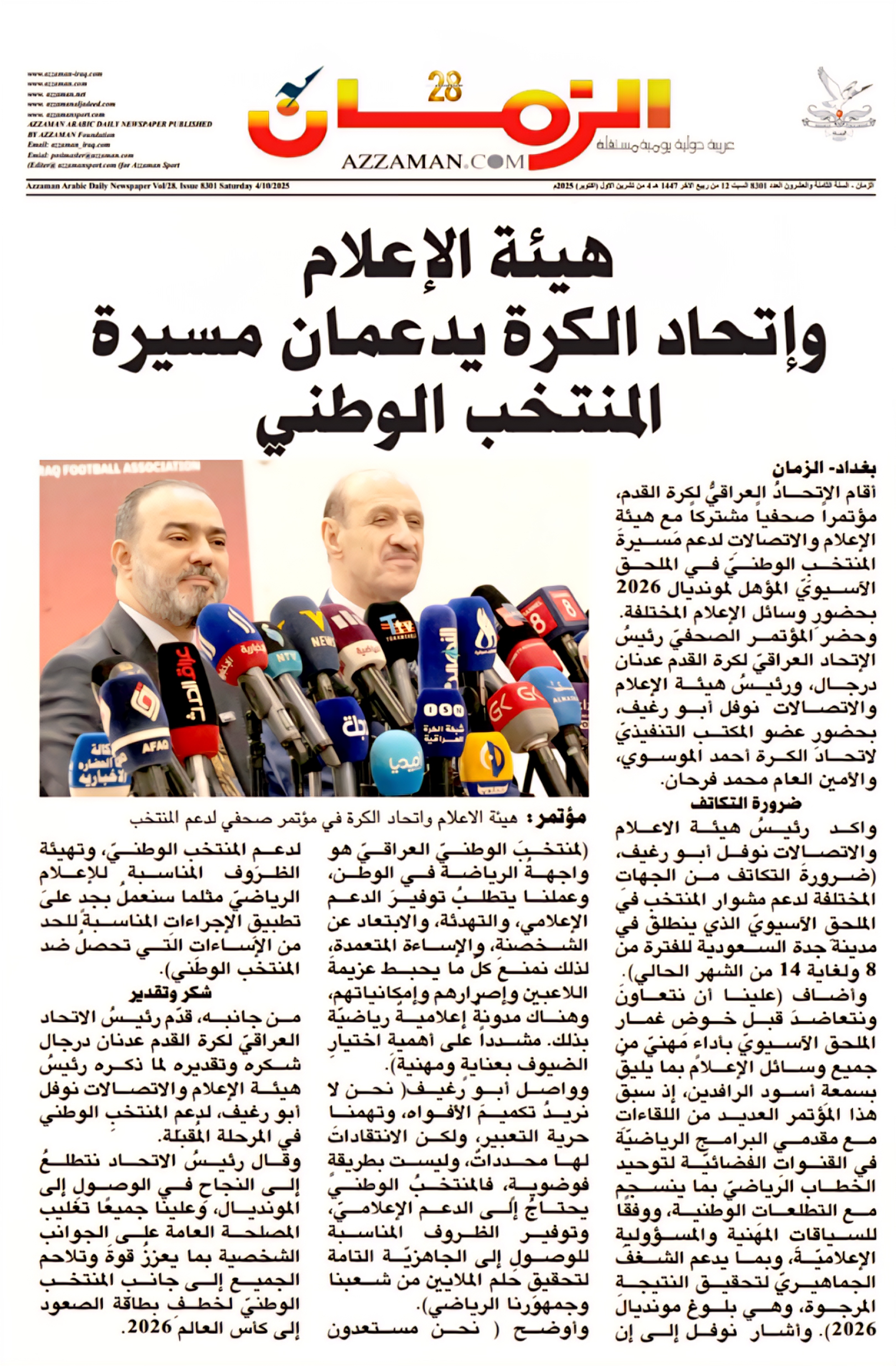 صحيفة الزمان .. هيأة الاعلام واتحاد الكرة يدعمان مسيرة المنتخب الوطني