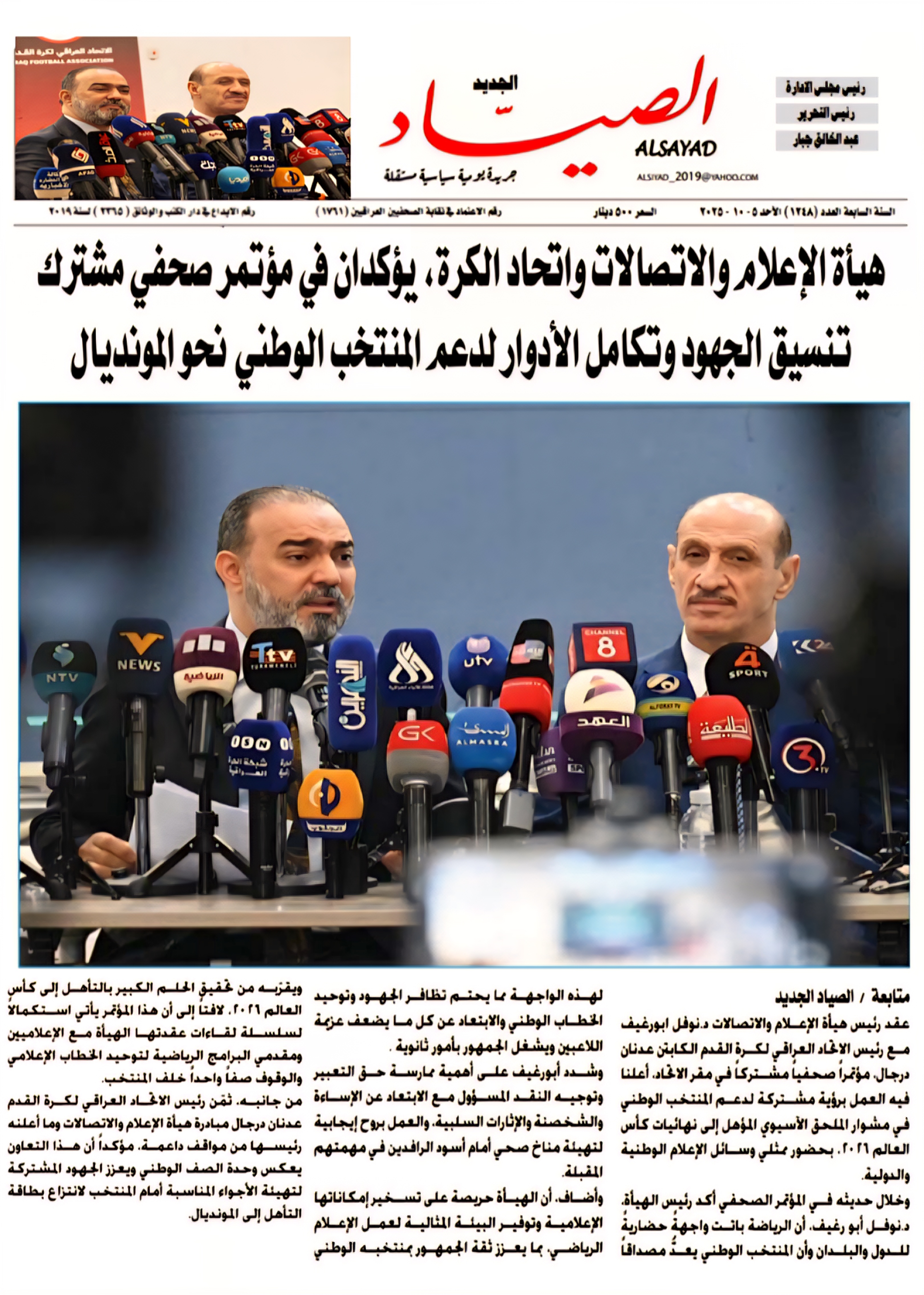 صحيفة الصياد .. هيأة الاعلام والاتصالات واتحاد الكرة يؤكدان في مؤتمر مشترك دعم المنتخب الوطني