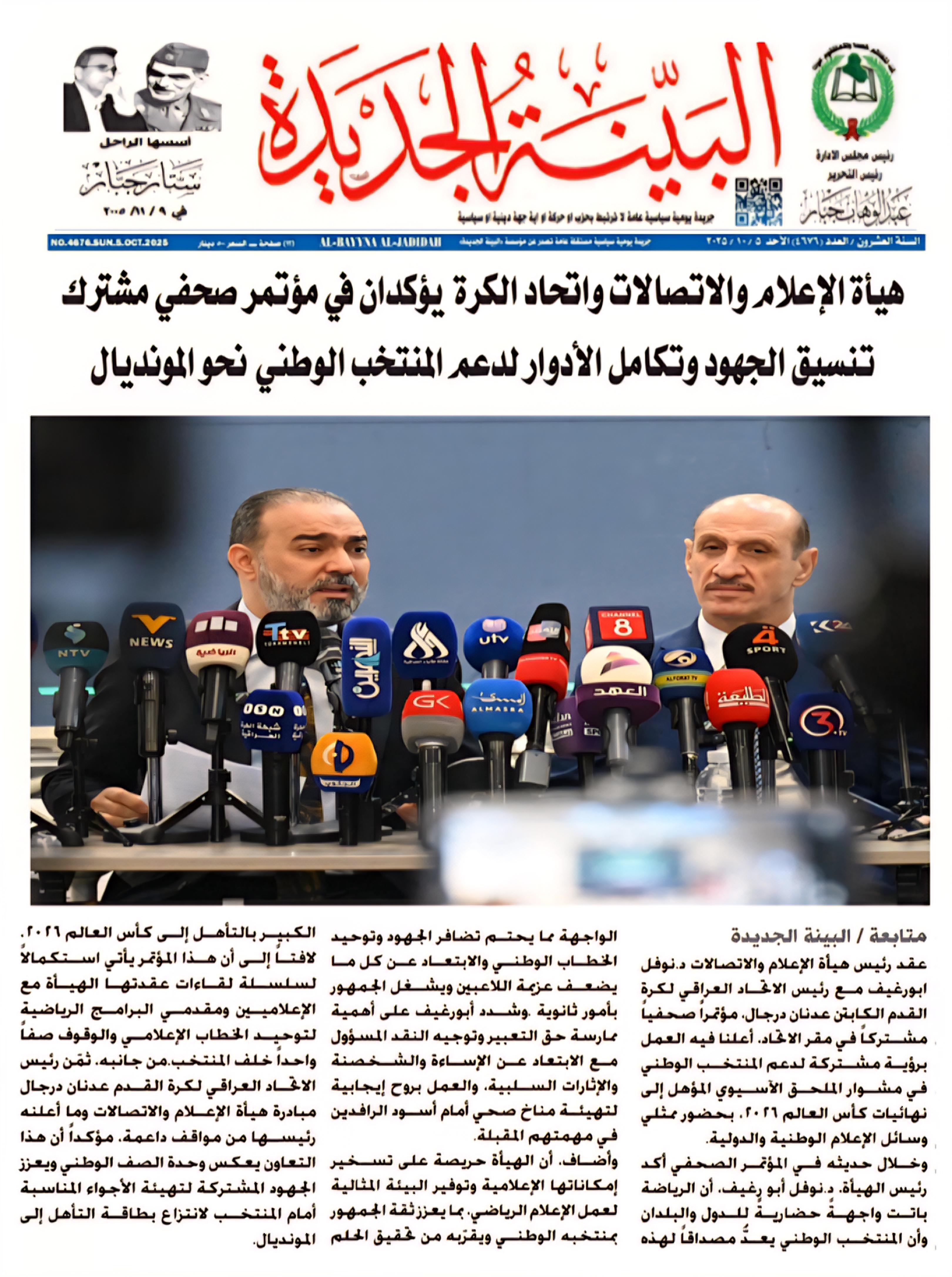 صحيفة البينة .. هيأة الاعلام والاتصالات واتحاد الكرة يؤكدان دعم المنتخب الوطني