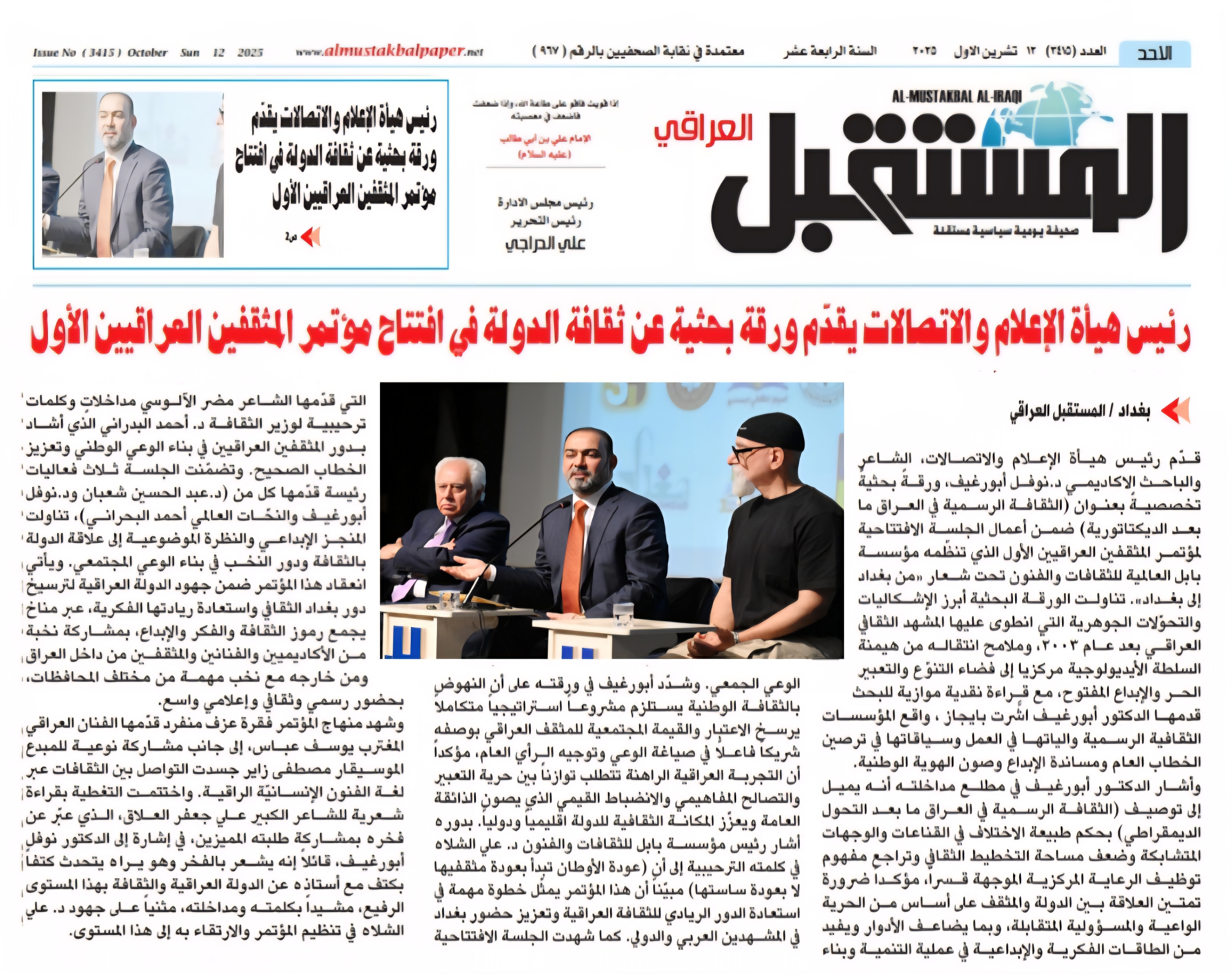 صحيفة المستقبل .. رئيس هيأة الاعلام يقدم ورقة بحثية عن ثقافة الدولة في افتتاح مؤتمر المثقفين العراقيين الاول