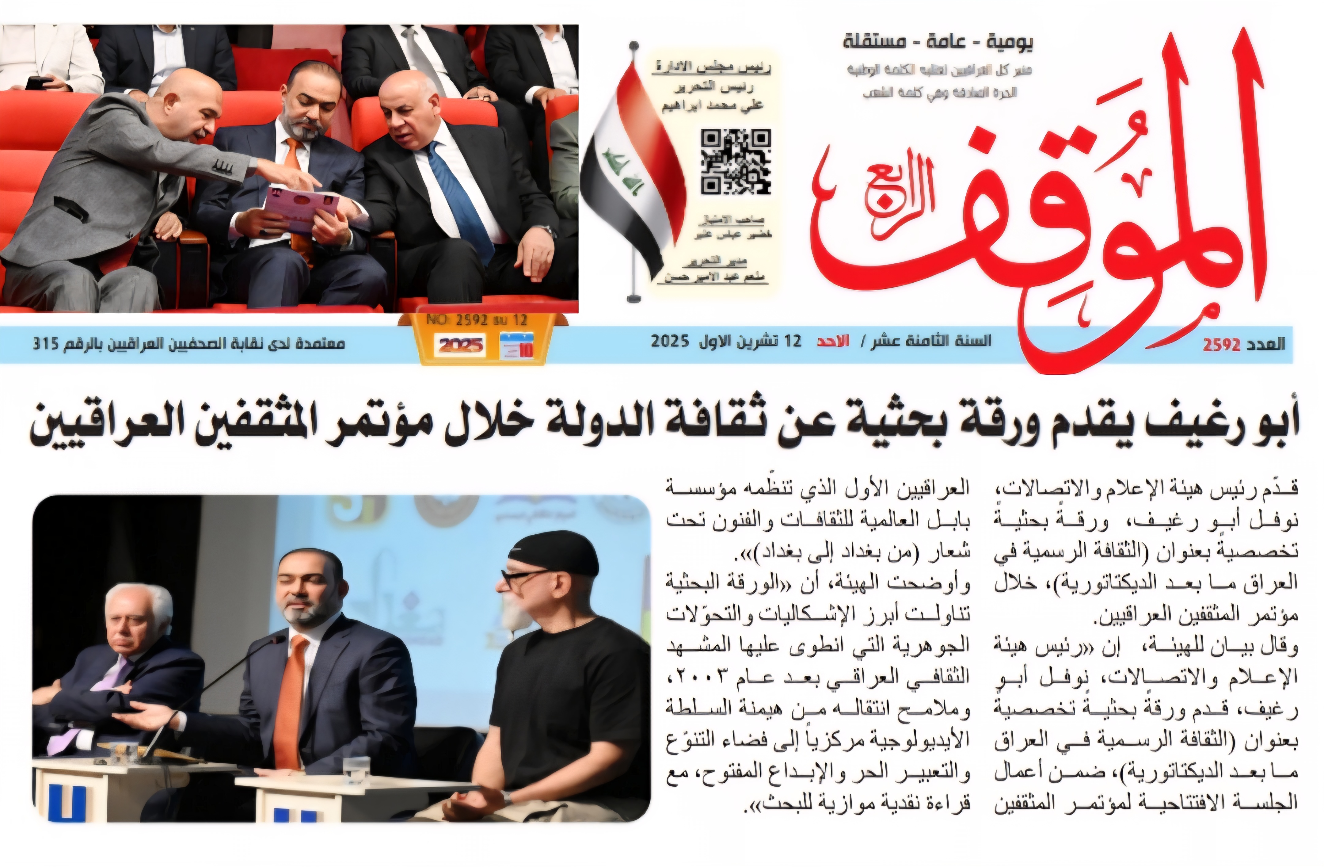 صحيفة الموقف .. د.نوفل ابورغيف يقدم ورقة بحثية عن ثقافة الدولة في افتتاح مؤتمر المثقفين العراقيين الاول