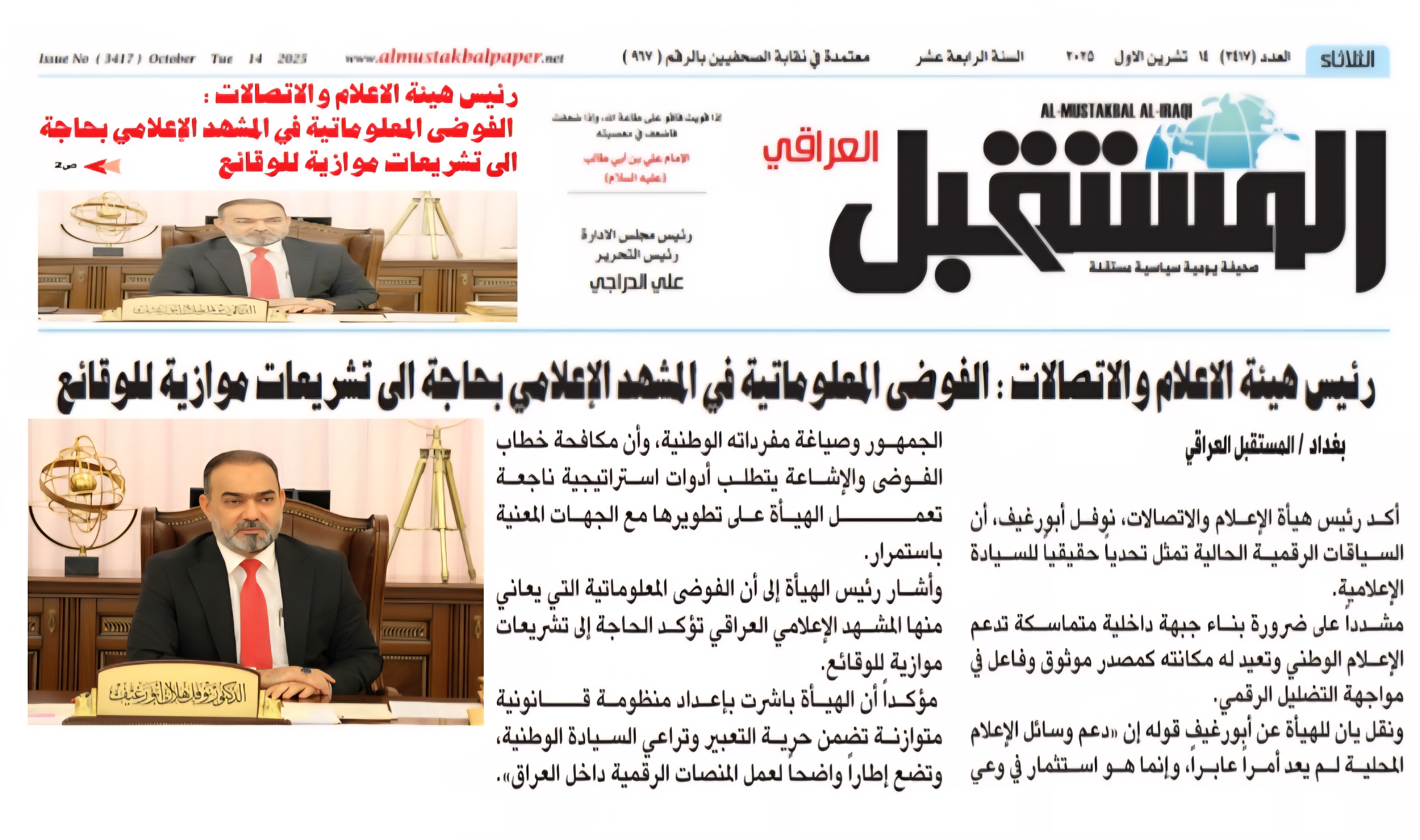 صحيفة المستقبل .. رئيس هيأة الاعلام والاتصالات : الفوضى المعلوماتية في المشهد الاعلامي بحاجة الى تشريعات موازية للوقائع
