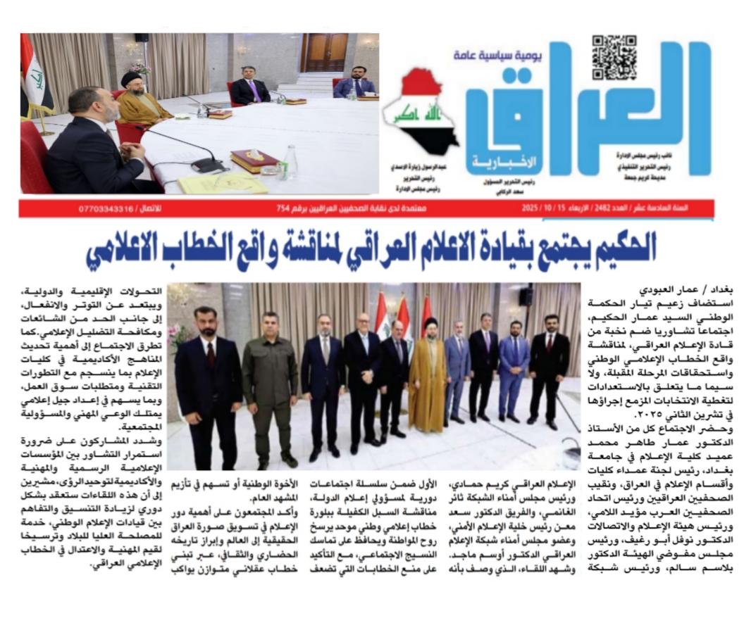 صحيفة العراق الاخبارية .. السيد الحكيم يجتمع بقيادات الاعلام العراقي لمناقشة واقع الخطاب الاعلامي