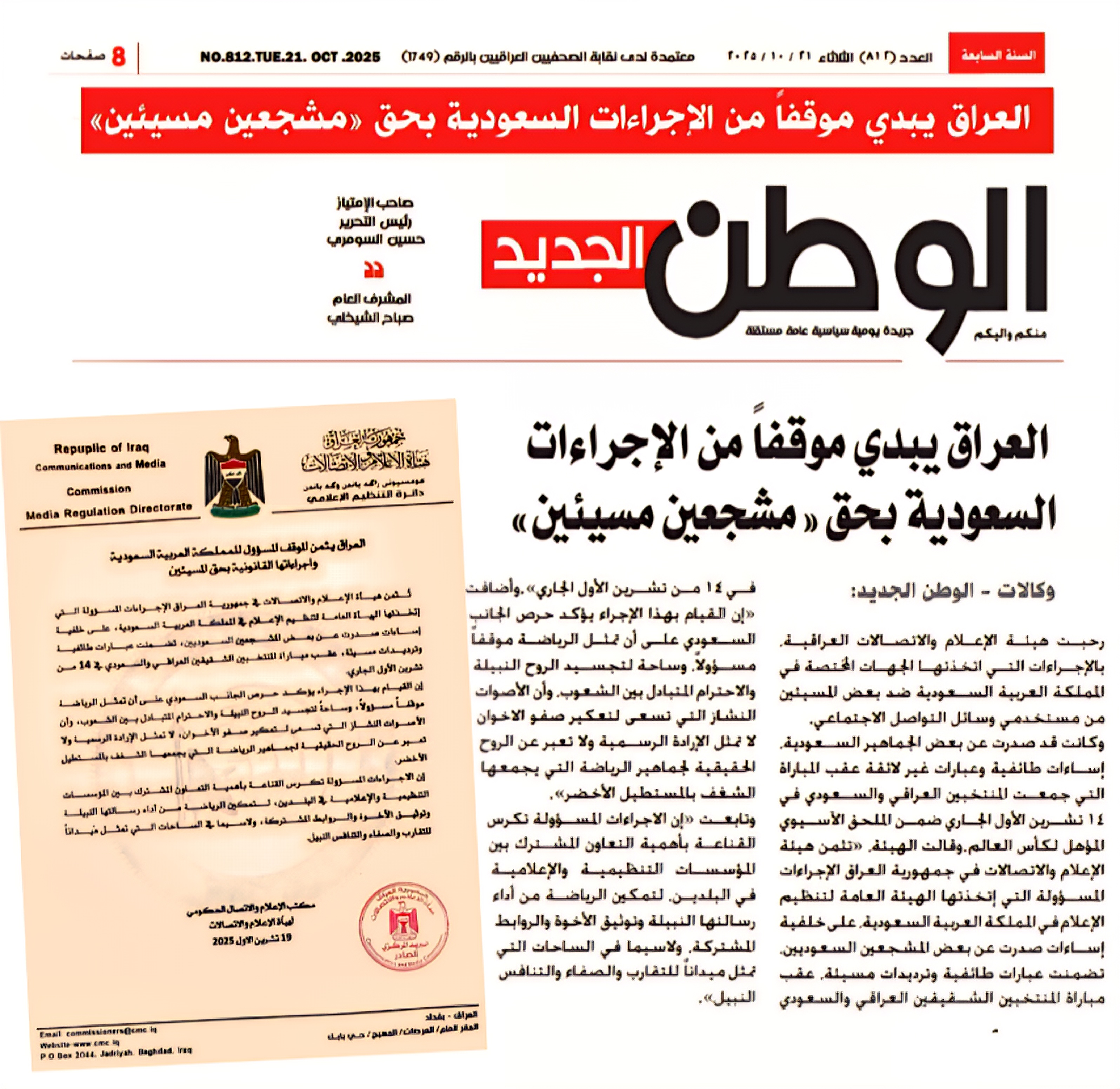 صحيفة الوطن .. العراق يبدي موقفاً من الاجراءات السعودية بحق " مشجعين مسيئين