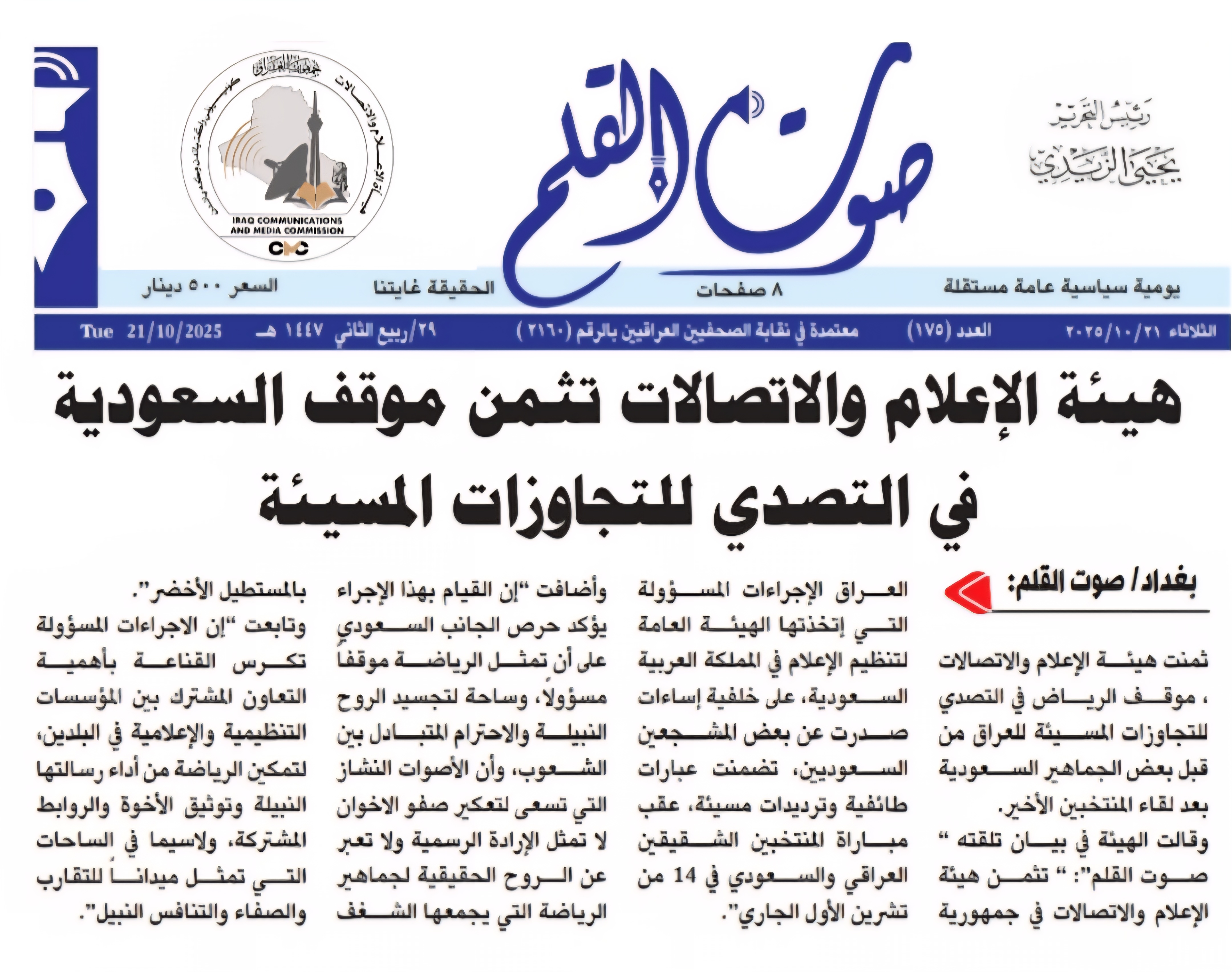 صحيفة صوت القلم .. هيأة الاعلام والاتصالات تثمن موقف السعودية في التصدي للتجاوزات المسيئة