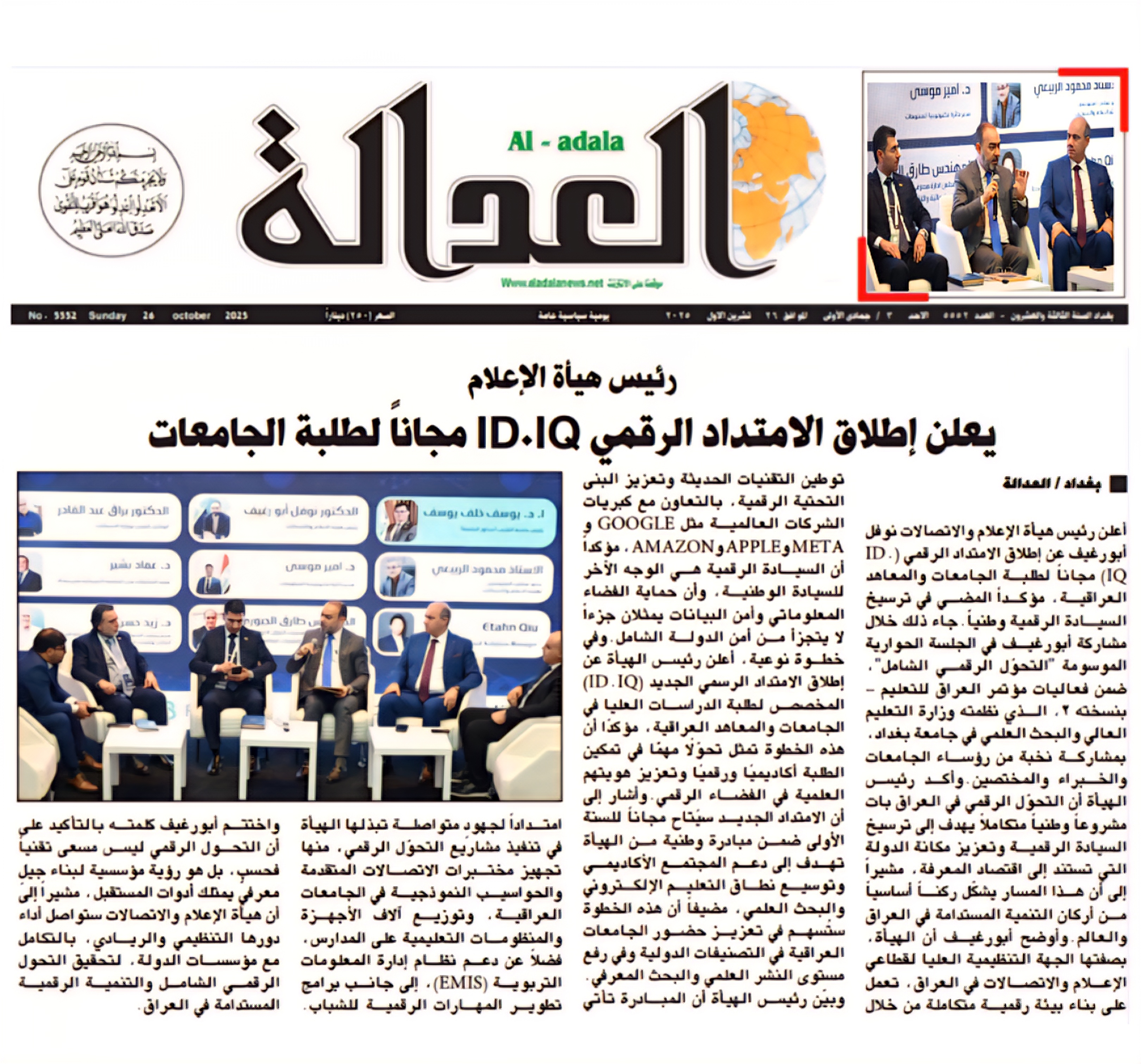 صحيفة العدالة .. رئيس هيأة الاعلام والاتصالات يعلن اطلاق الامتداد الرقمي (ID.IQ) مجانا للطلبة