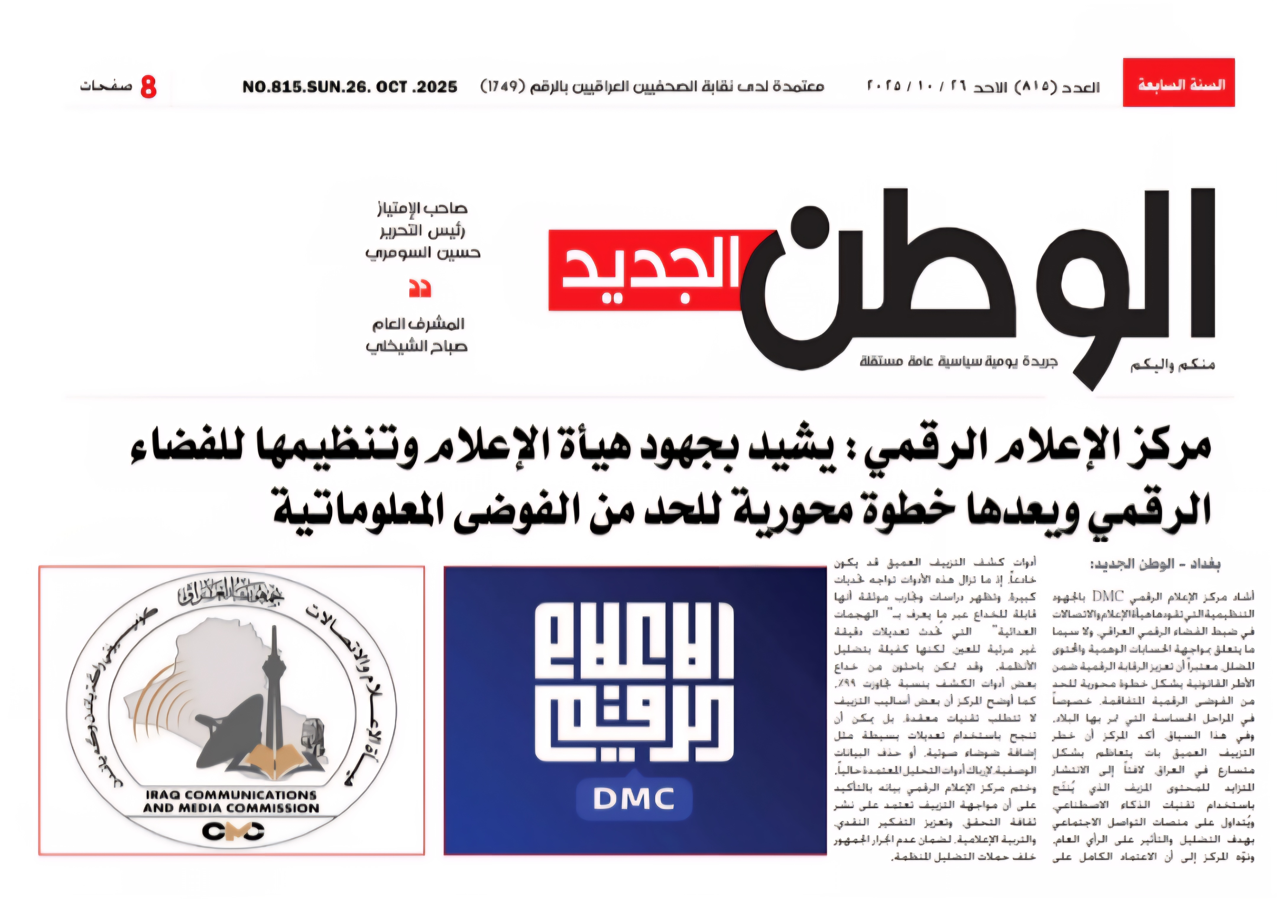 صحيفة الوطن .. مركز الاعلام الرقمي يشيد بجهود هيأة الاعلام وتنظيمها للفضاء الرقمي