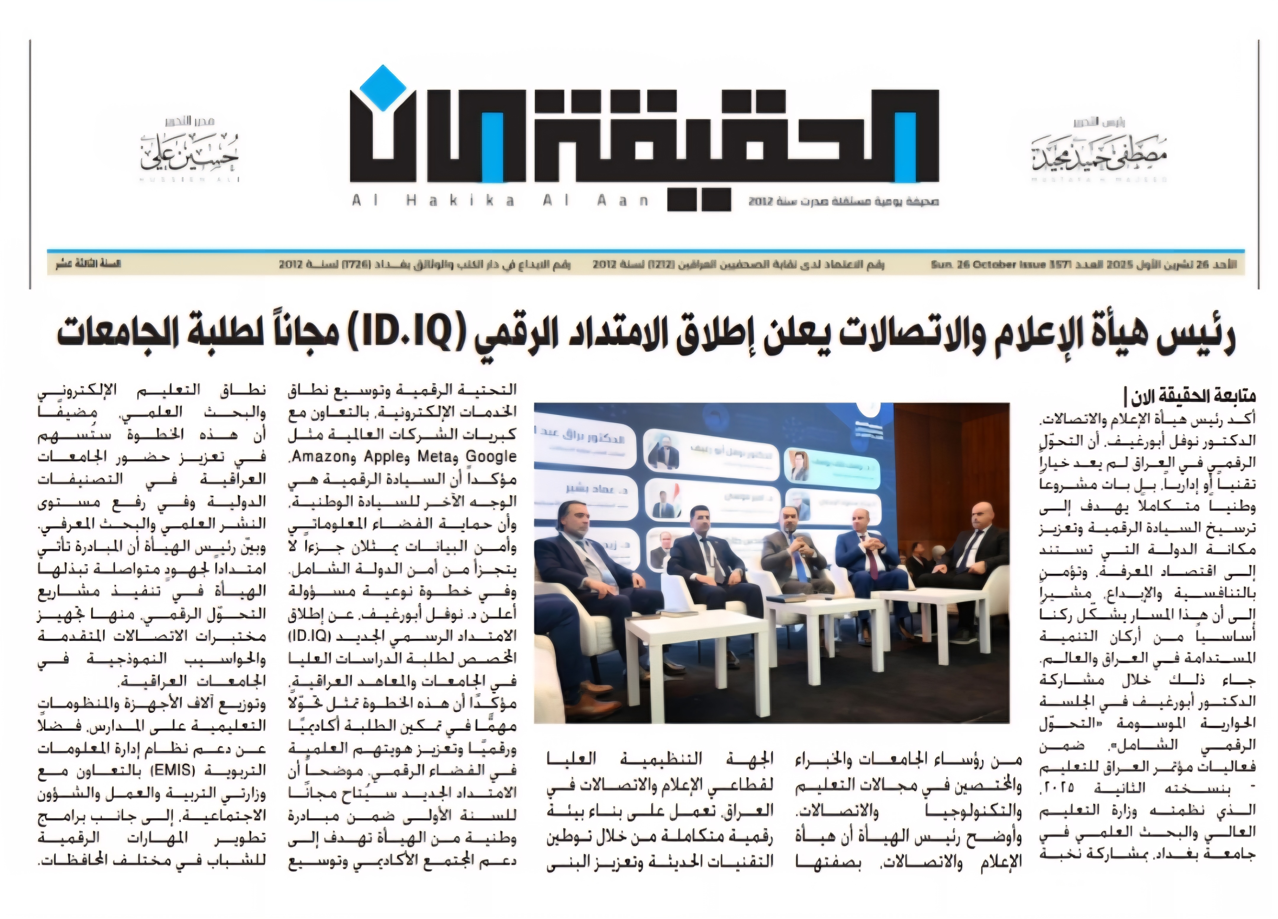 صحيفة الحقيقة الان .. رئيس هيأة الاعلام والاتصالات يعلن اطلاق الامتداد الرقمي (ID.IQ) مجانا للطلبة