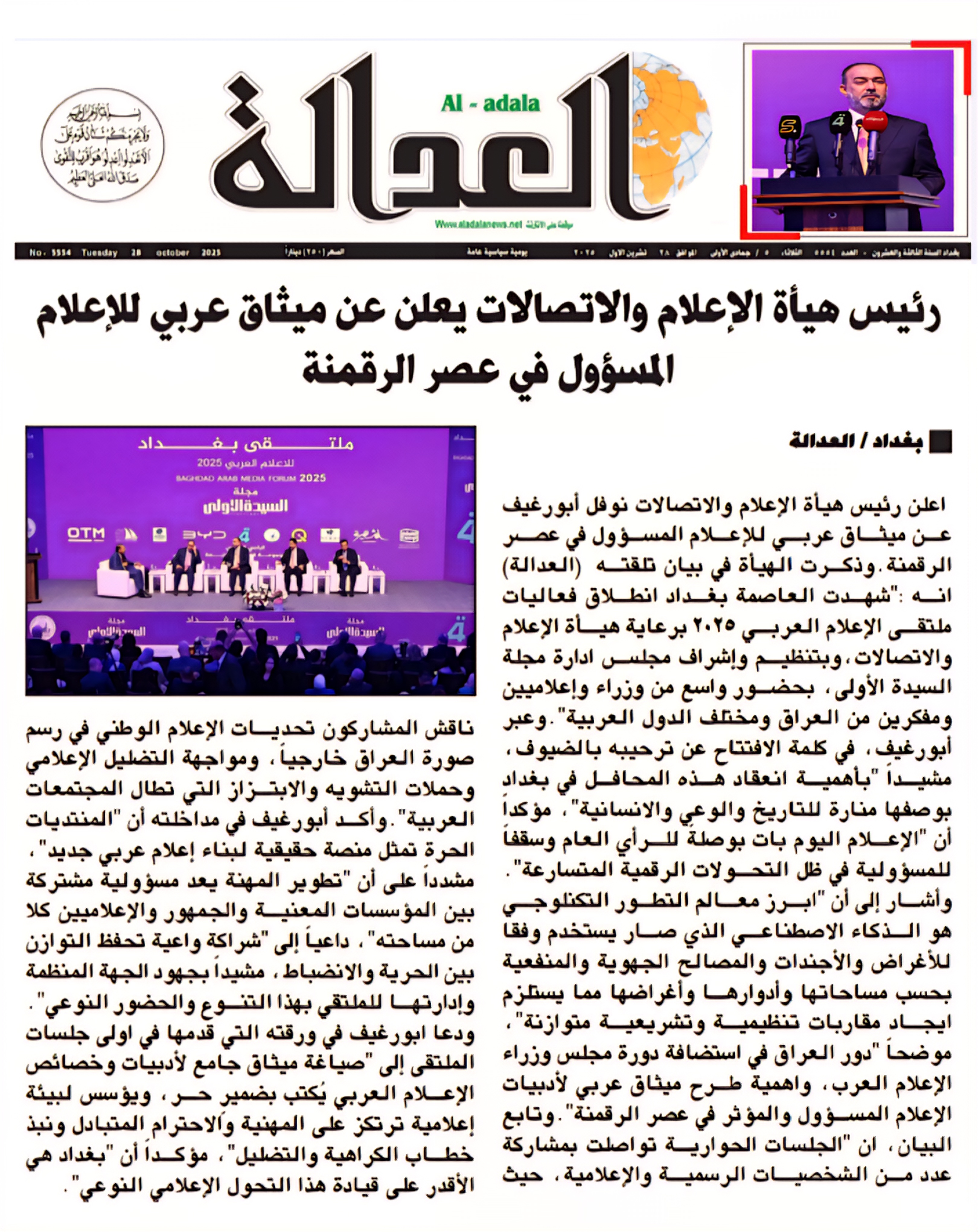 صحيفة العدالة .. د.نوفل ابورغيف يعلن عن ميثاق عربي للأعلام المسؤول في عصر الرقمنة