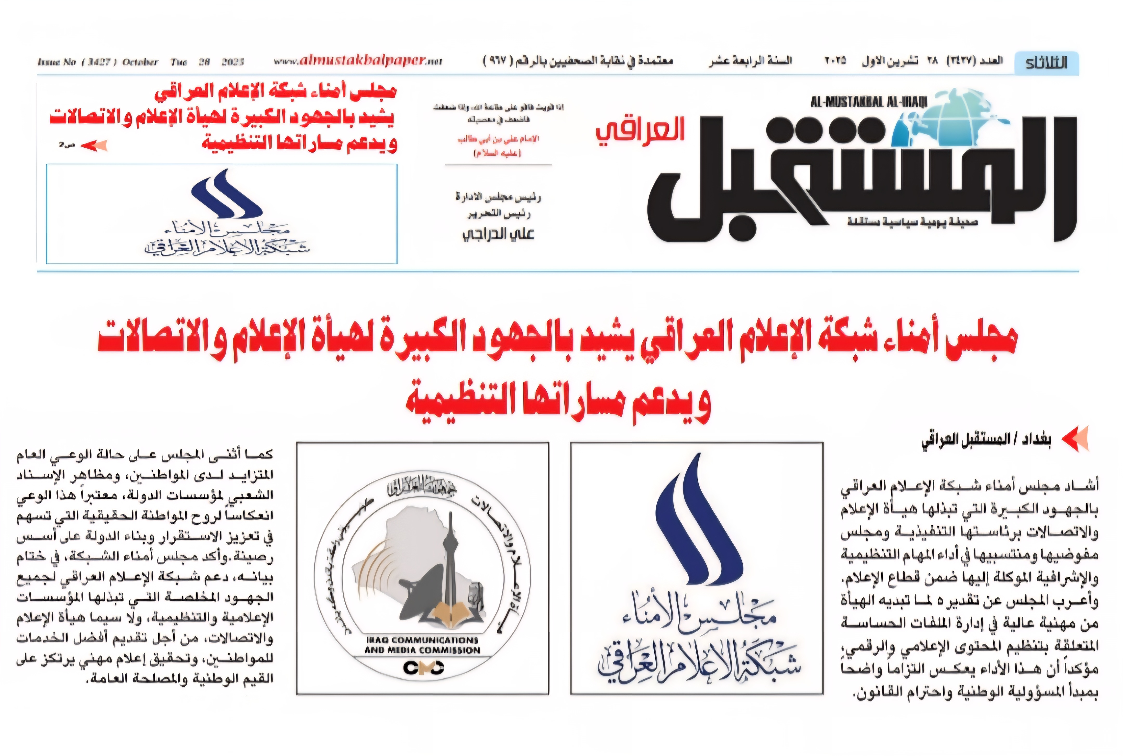 صحيفة المستقبل .. مجلس أمناء شبكة الإعلام العراقي يشيد بالجهود الكبيرة لهيأة الإعلام والاتصالات ويدعم مساراتها التنظيمية