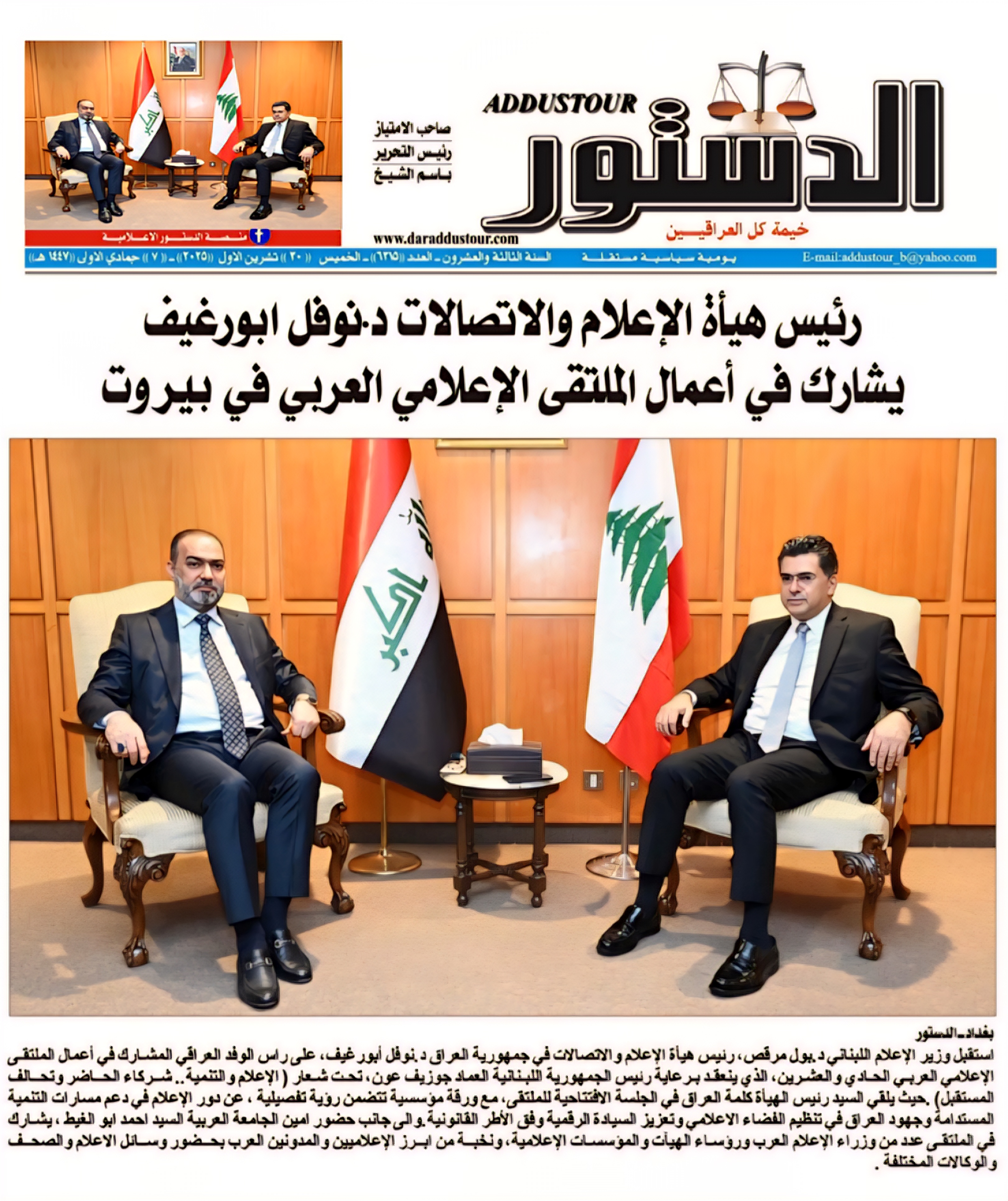 صحيفة الدستور.. رئيس هيأة الاعلام والاتصالات يشارك في اعمال الملتقى الاعلامي العربي في بيروت