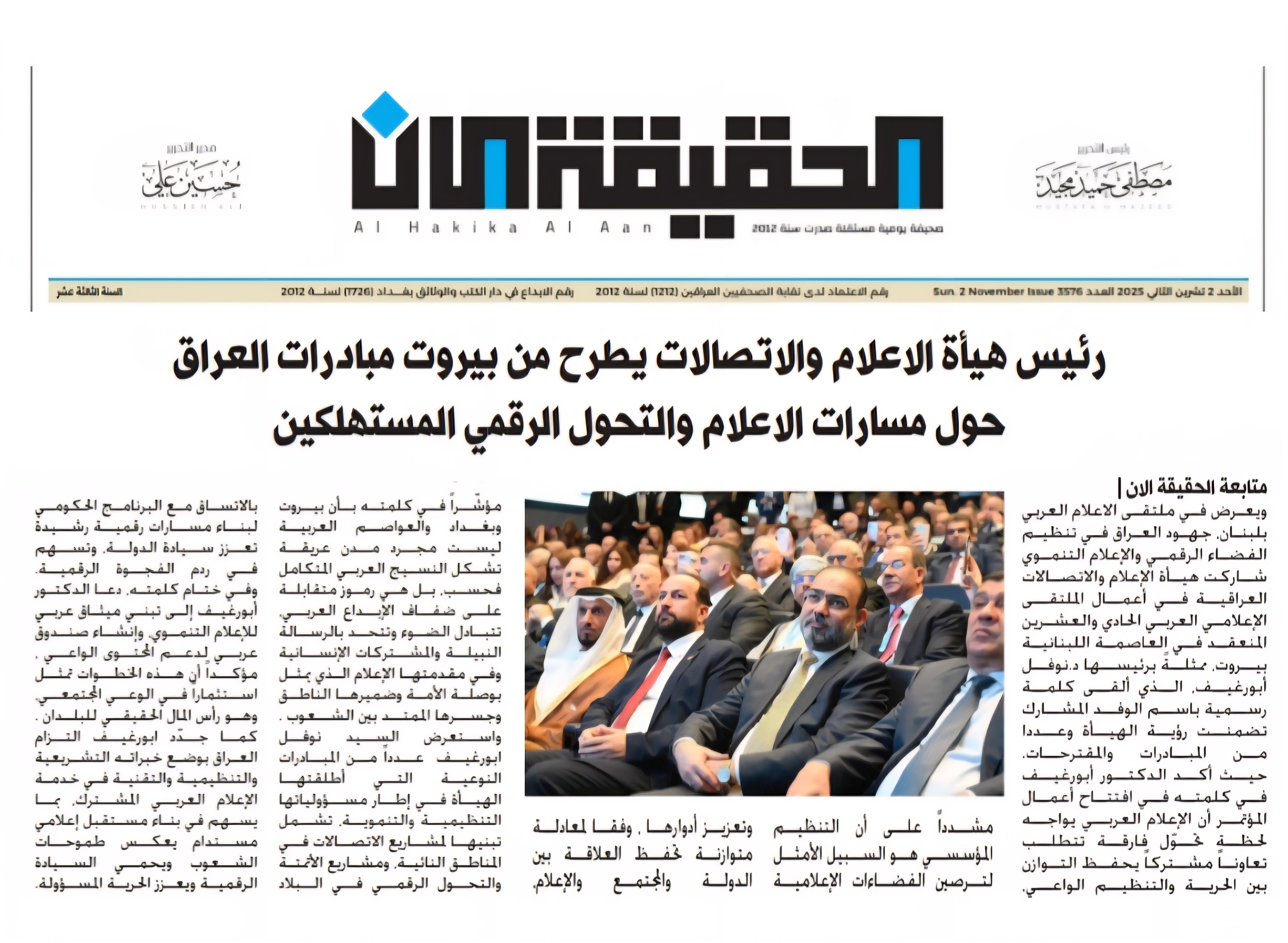 صحيفة الحقيقة الان.. رئيس هيأة الاعلام والاتصالات يطرح من بيروت مبادرات العراق حول مسارات الاعلام والتحول الرقمي المستهلكين