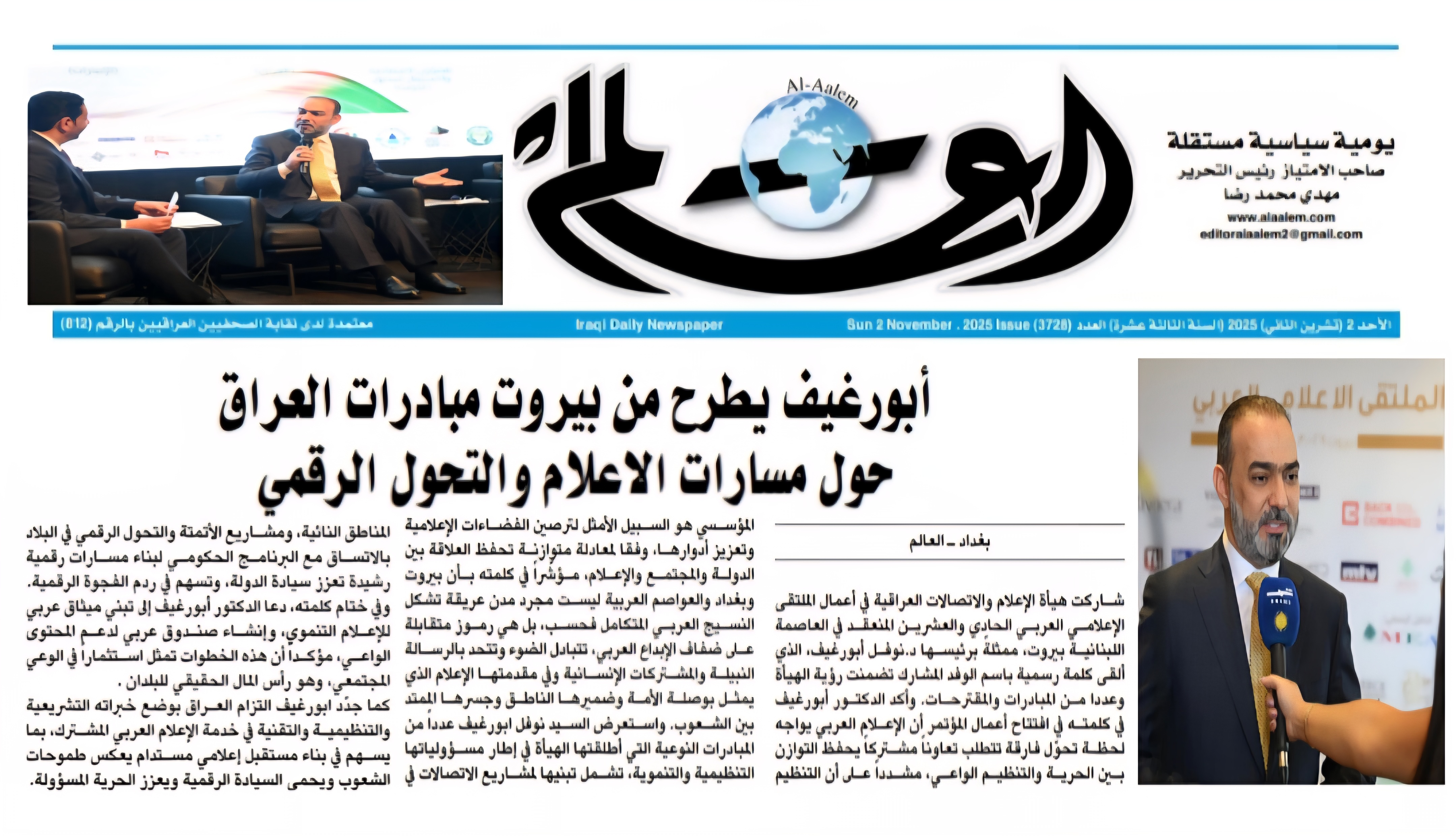 صحيفة الوطن.. ابورغيف يطرح من بيروت مبادرات العراق حول مسارات الاعلام والتحول الرقمي