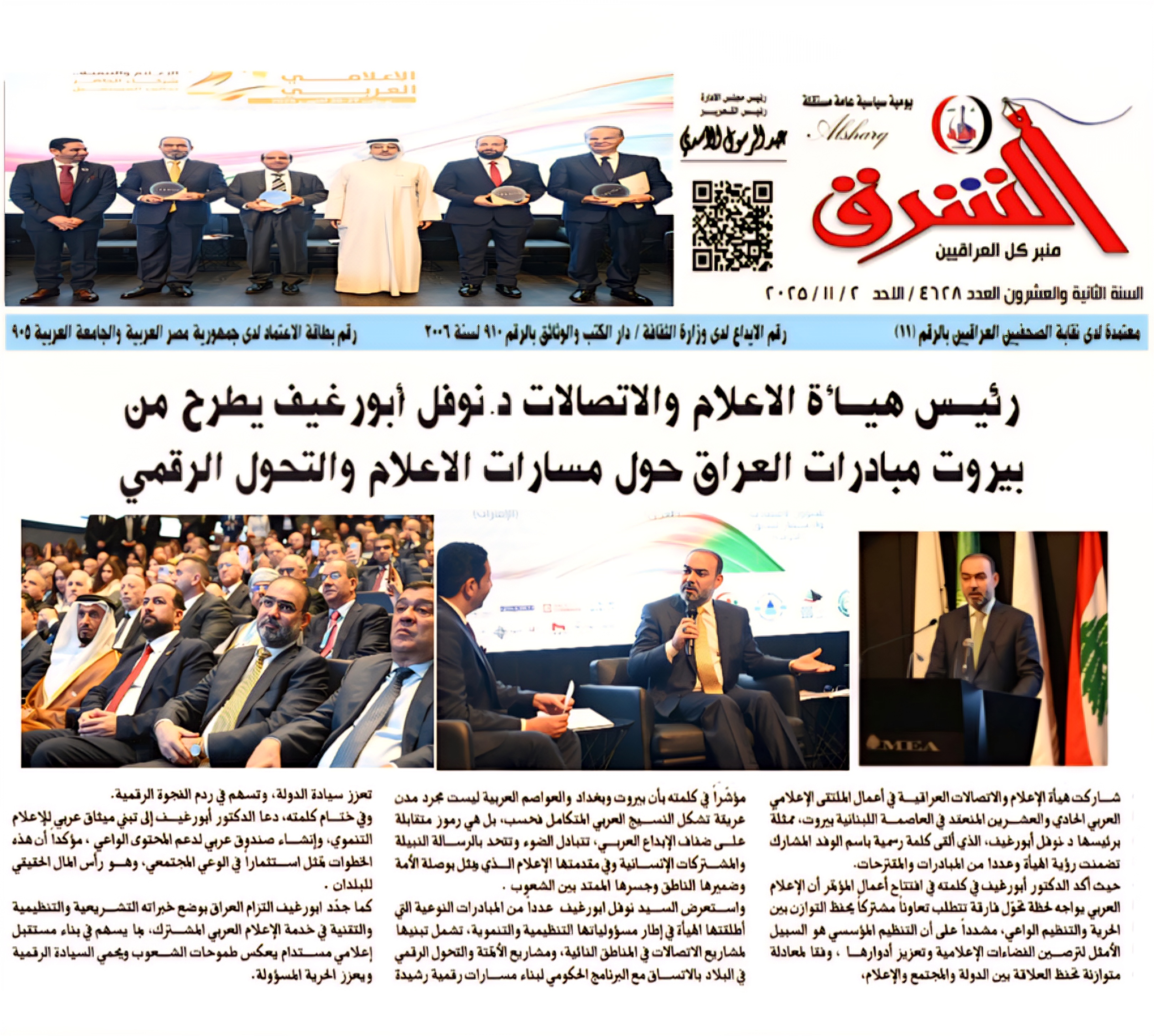 صحيفة الشرق.. رئيس هيأة الاعلام والاتصالات يطرح من بيروت مبادرات العراق حول مسارات الاعلام والتحول الرقمي