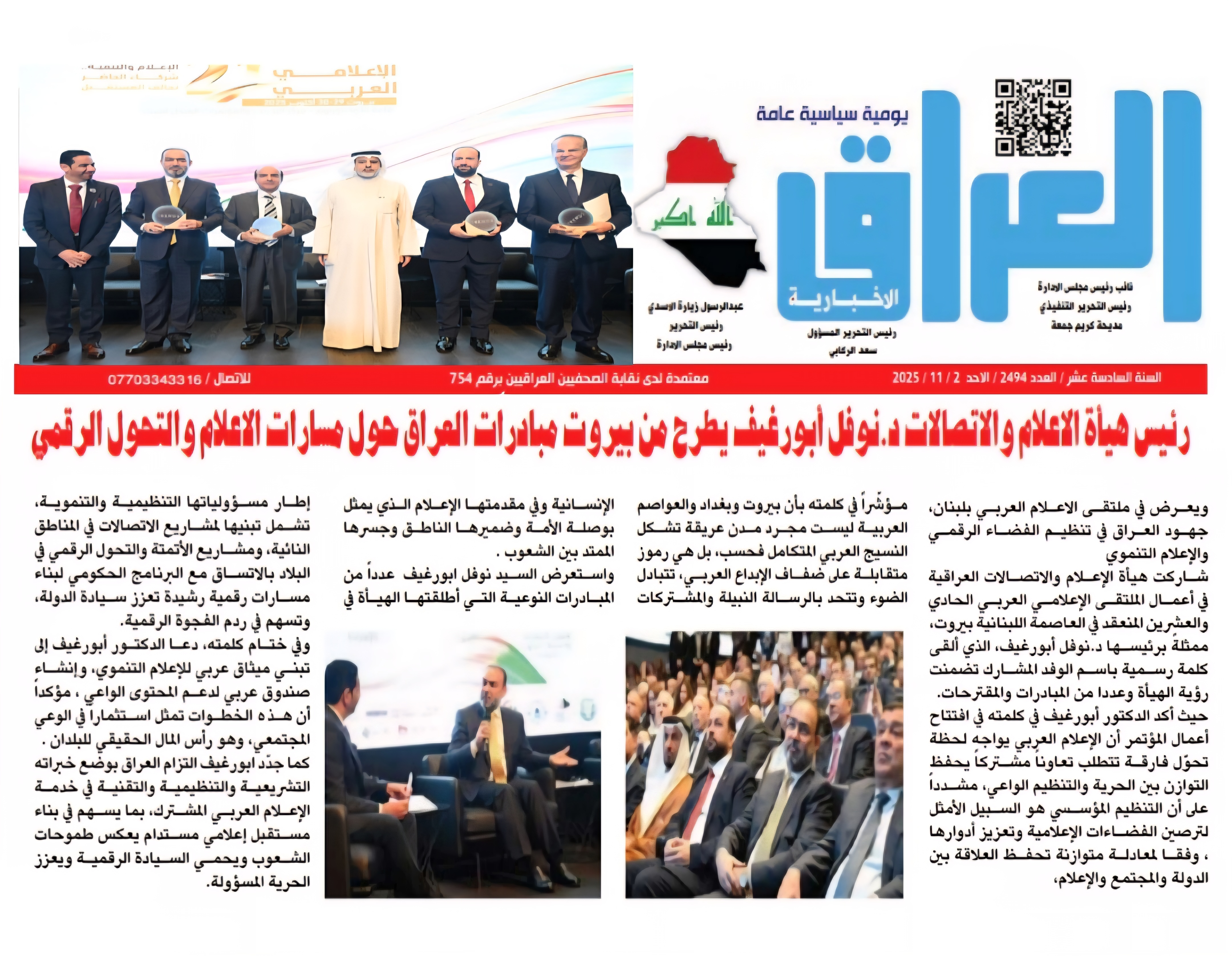 صحيفة الوطن.. ابورغيف يطرح من بيروت مبادرات العراق حول مسارات الاعلام والتحول الرقمي