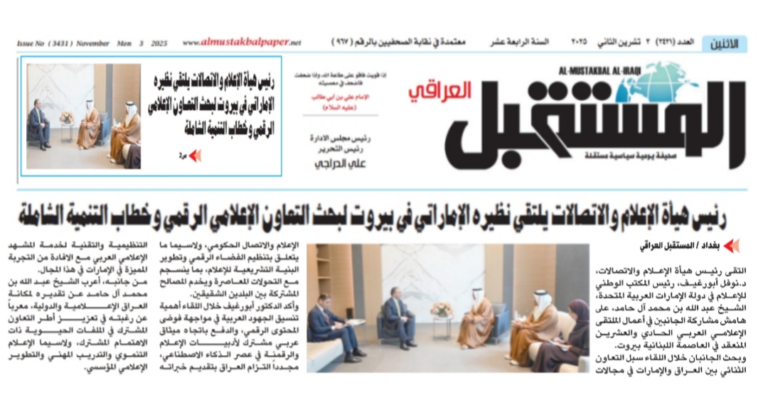 صحيفة المستقبل.. رئيس هيأة الاعلام والاتصالات يلتقي نظيره الاماراتي في بيروت لبحث التعاون الاعلامي الرقمي