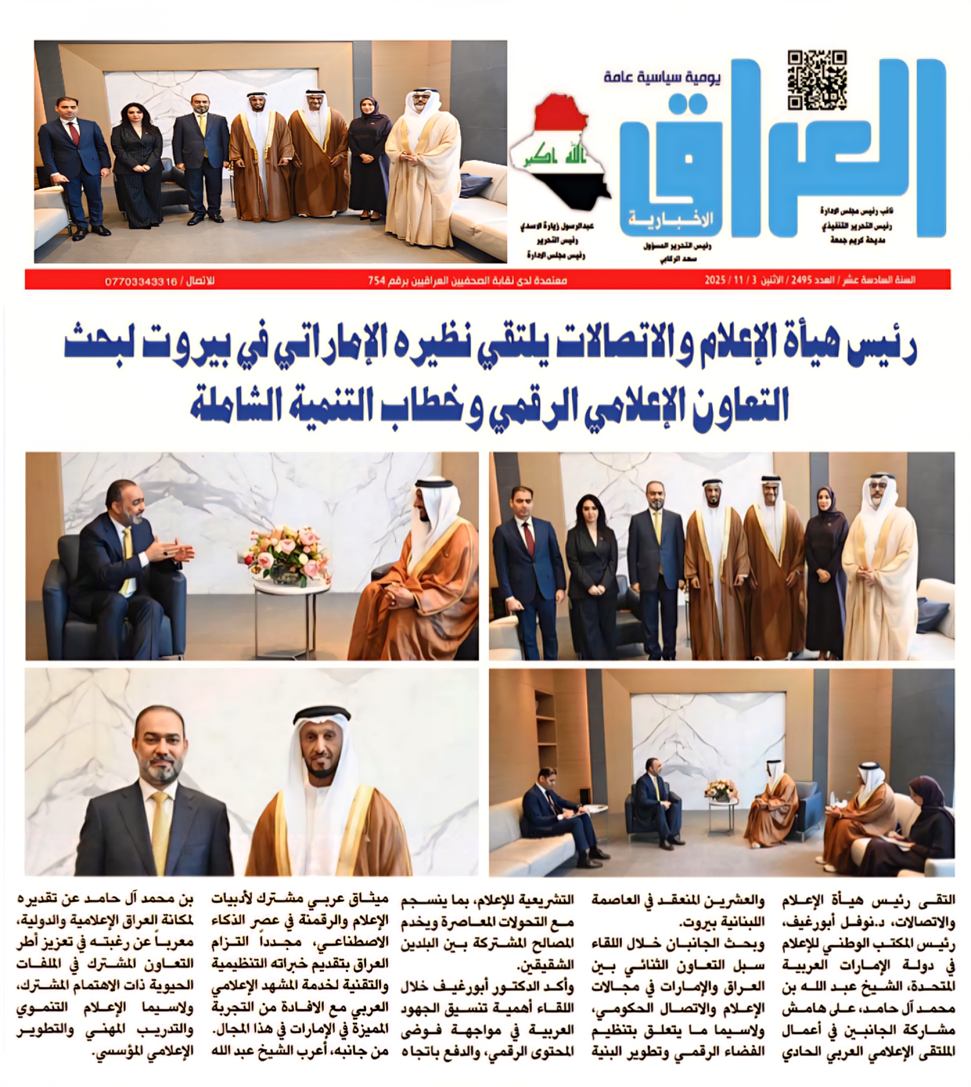 صحيفة العراق الاخبارية.. رئيس هيأة الاعلام والاتصالات يلتقي نظيره الاماراتي في بيروت لبحث التعاون الاعلامي الرقمي