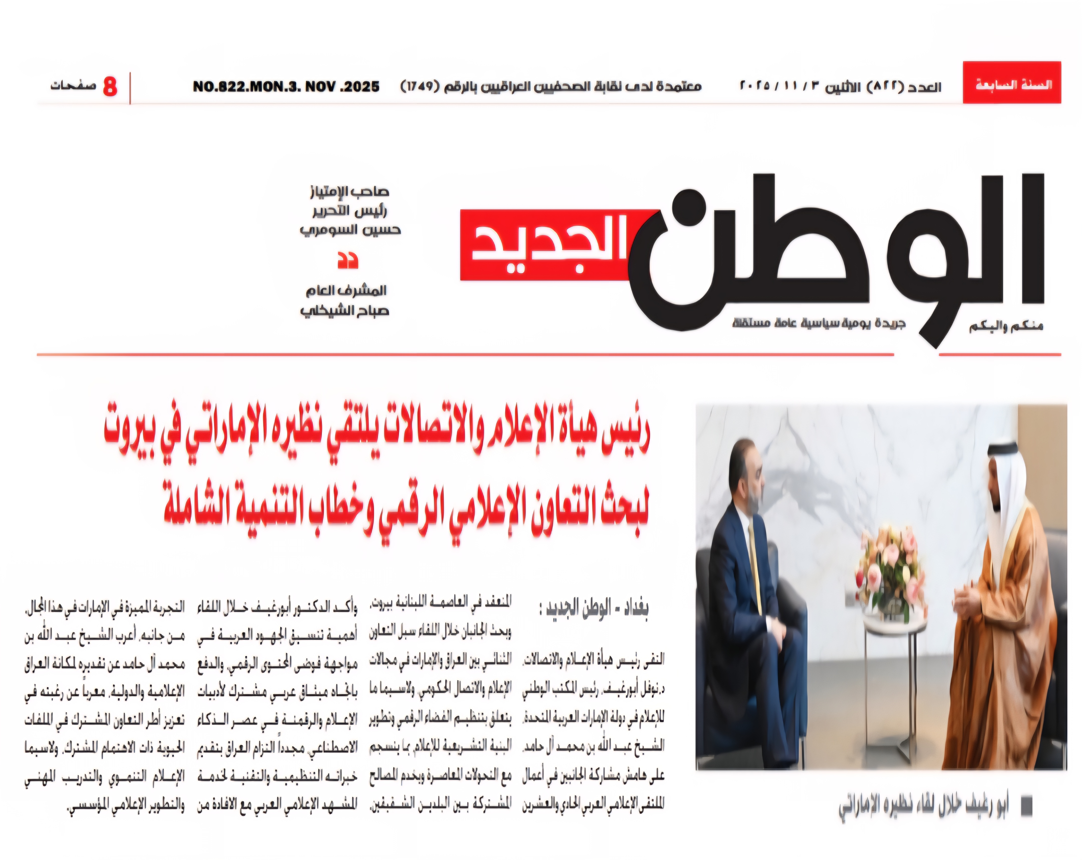 صحيفة الوطن.. رئيس هيأة الاعلام والاتصالات يلتقي نظيره الاماراتي في بيروت لبحث التعاون الاعلامي الرقمي