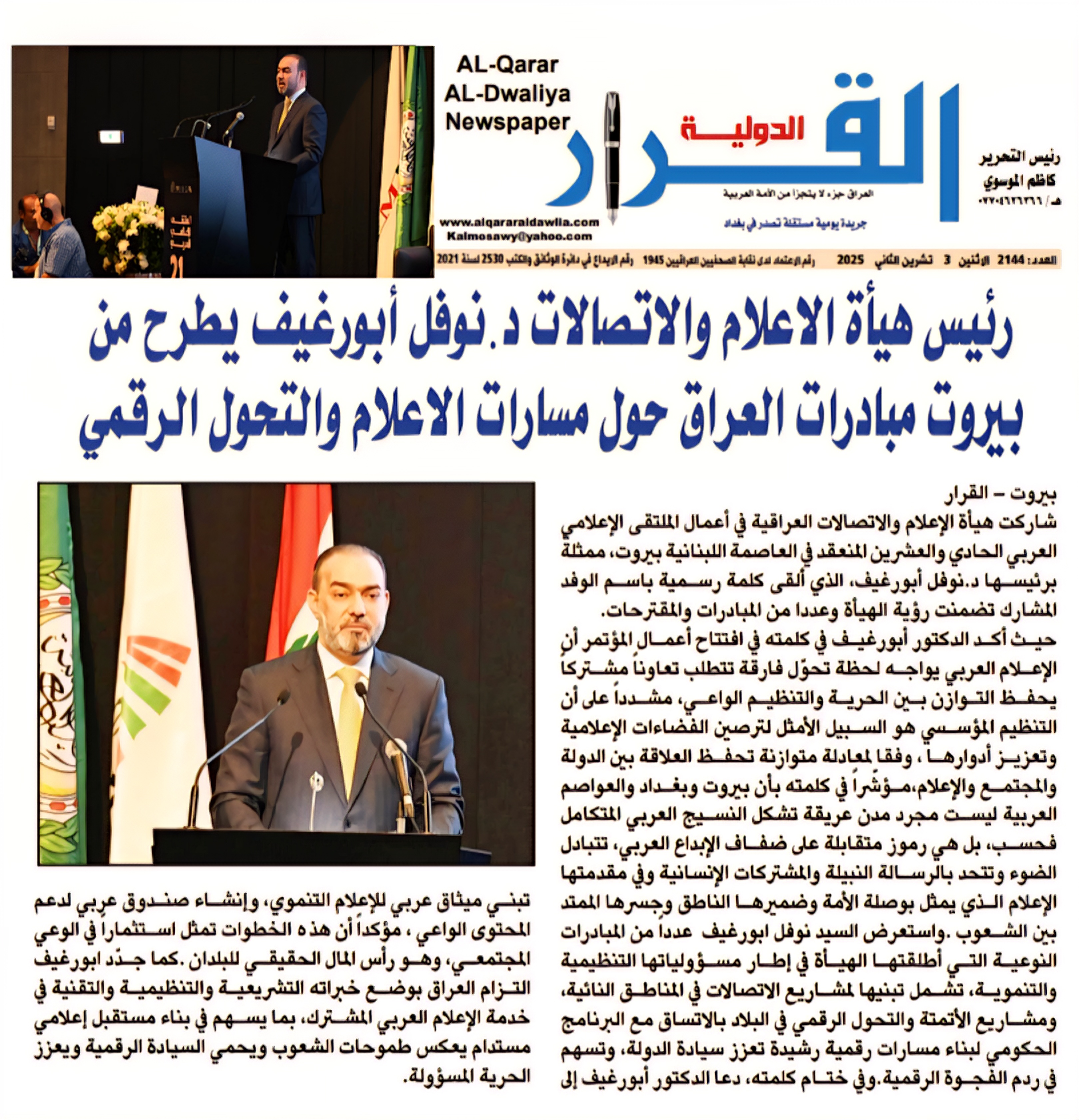 صحيفة القرار الدولية.. رئيس هيأة الاعلام والاتصالات يطرح من بيروت مبادرات العراق حول مسارات الاعلام والتحول الرقمي