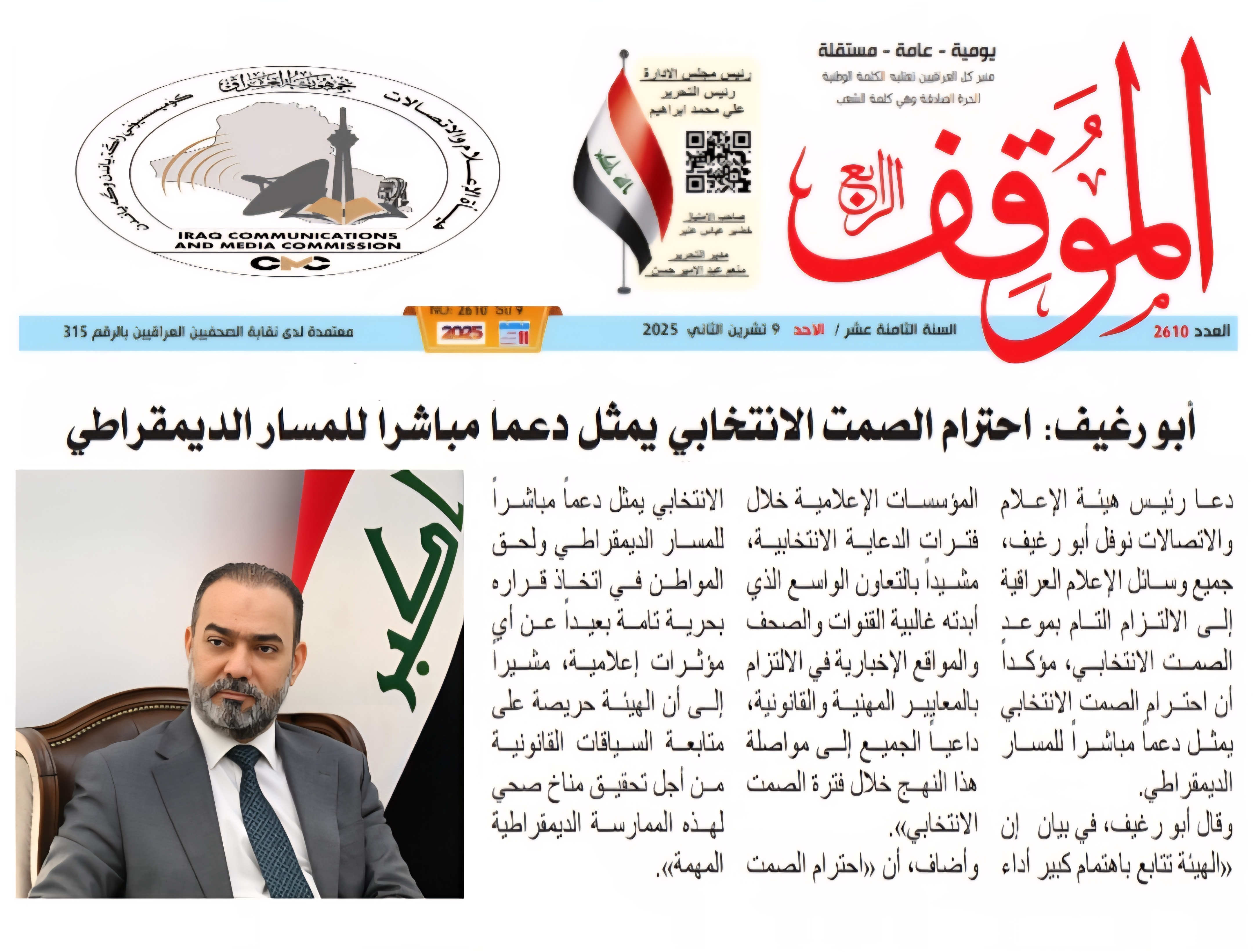 رئيس هيأة الاعلام والاتصالات : احترام الصمت الانتخابي يمثل دعماً مباشراً للمسار الديمقراطي