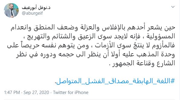 حين يشعر أحدهم بالإفلاس والعزلة وضعف المنطق وانعدام المسؤولية ، فإنه لايجد سوى الزعيق والشتائم والتهريج ، فالمأزوم لا ينتجُ سوى الأزمات ، ومن يتوهم نفسه حريصاً على وحدة المذهب عليه أولا أن ينظر الى حجمه ودوره في نظر الشارع وقناعة الجمهور . #اللغة_الهابطة_مصداق_الفشل_المتواصل.