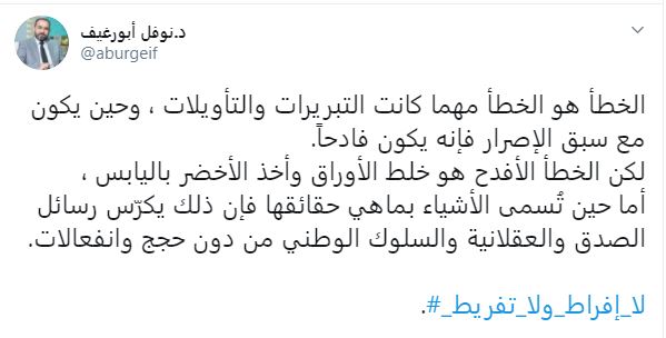 الخطأ هو الخطأ مهما كانت التبريرات والتأويلات ، وحين يكون مع سبق الإصرار فإنه يكون فادحاً. لكن الخطأ الأفدح هو خلط الأوراق وأخذ الأخضر باليابس ، أما حين تُسمى الأشياء بماهي حقائقها فإن ذلك يكرّس رسائل الصدق والعقلانية والسلوك الوطني من دون حجج وانفعالات. #_لا_إفراط_ولا_تفريط.