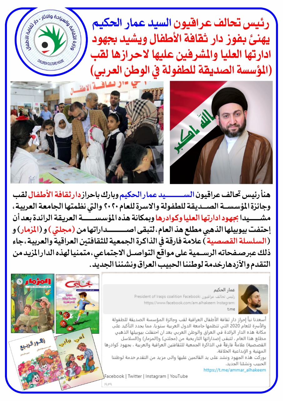 أسعدنا نبأ إحراز دار ثقافة الأطفال العراقية لقب وجائزة المؤسسة الصديقة للطفولة والأسرة للعام 2020 التي تنظمها جامعة الدول العربية سنويا، مما يجدد التأكيد على مكانة هذه الدار الرائدة في العراق والوطن العربي بعد ان احتفلت بيوبيلها الذهبي مطلع هذا العام ، لتبقى إصداراتها التاريخية من (مجلتي) و(المزمار) و(السلاسل القصصية) علامةً فارقةً في الذاكرة الجمعية للثقافتين العراقية والعربية ، بجهود كوادرها المهنية و الإبداعية الخلاقة. بوركت هذه الجهود ونشد على يد القائمين عليها والى مزيد من التقدم خدمة لوطننا الحبيب ونشئنا الجديد.