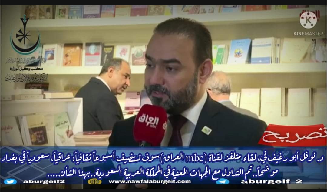 د.نوفل أبو رغيف في لقاء متلفز لقناة العراق mbc سوف نستضيف أسبوعاَ ثقافياَ عراقياً سعودياً في بغداد موضحأ تم التداول مع الجهات المعنية في المملكة العربية السعودية..بهذا الشأن....
