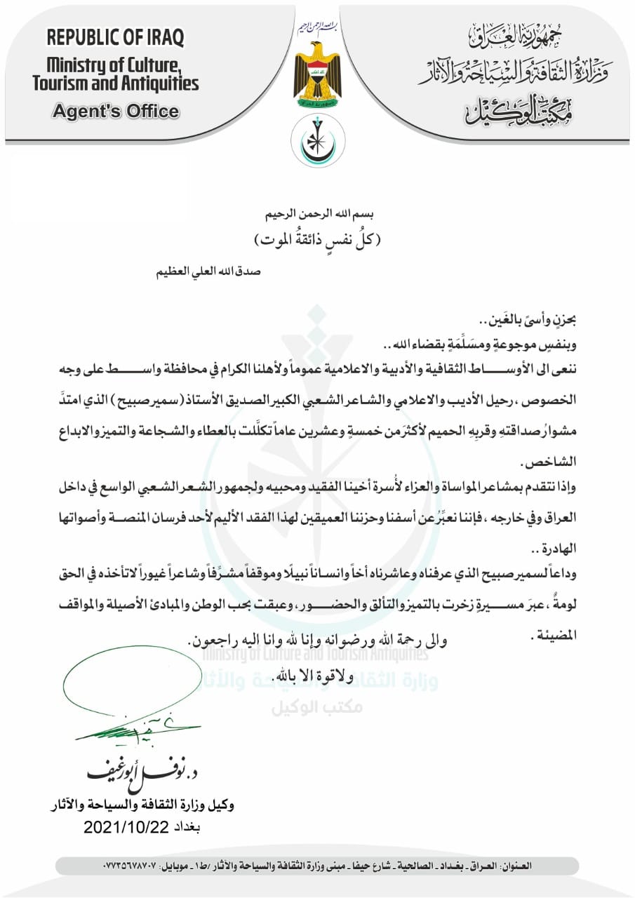 وبنفسٍ موجوعةٍ ومسَلِّمَةٍ بقضاء الله ،، ننعى الى الأوساط الثقافية والأدبية والاعلامية عموماً ولأهلنا الكرام في محافظة واسط على وجه الخصوص ، رحيل الأديب والاعلامي والشاعر الشعبي الكبير الصديق الأستاذ(سمير صبيح) الذي امتدَّ مشوارُ صداقتهِ وقربِهِ الحميم لأكثرَ من خمسةٍ وعشرين عاماً تكلَّلت بالعطاء والشجاعة والتميز والابداع الشاخص.