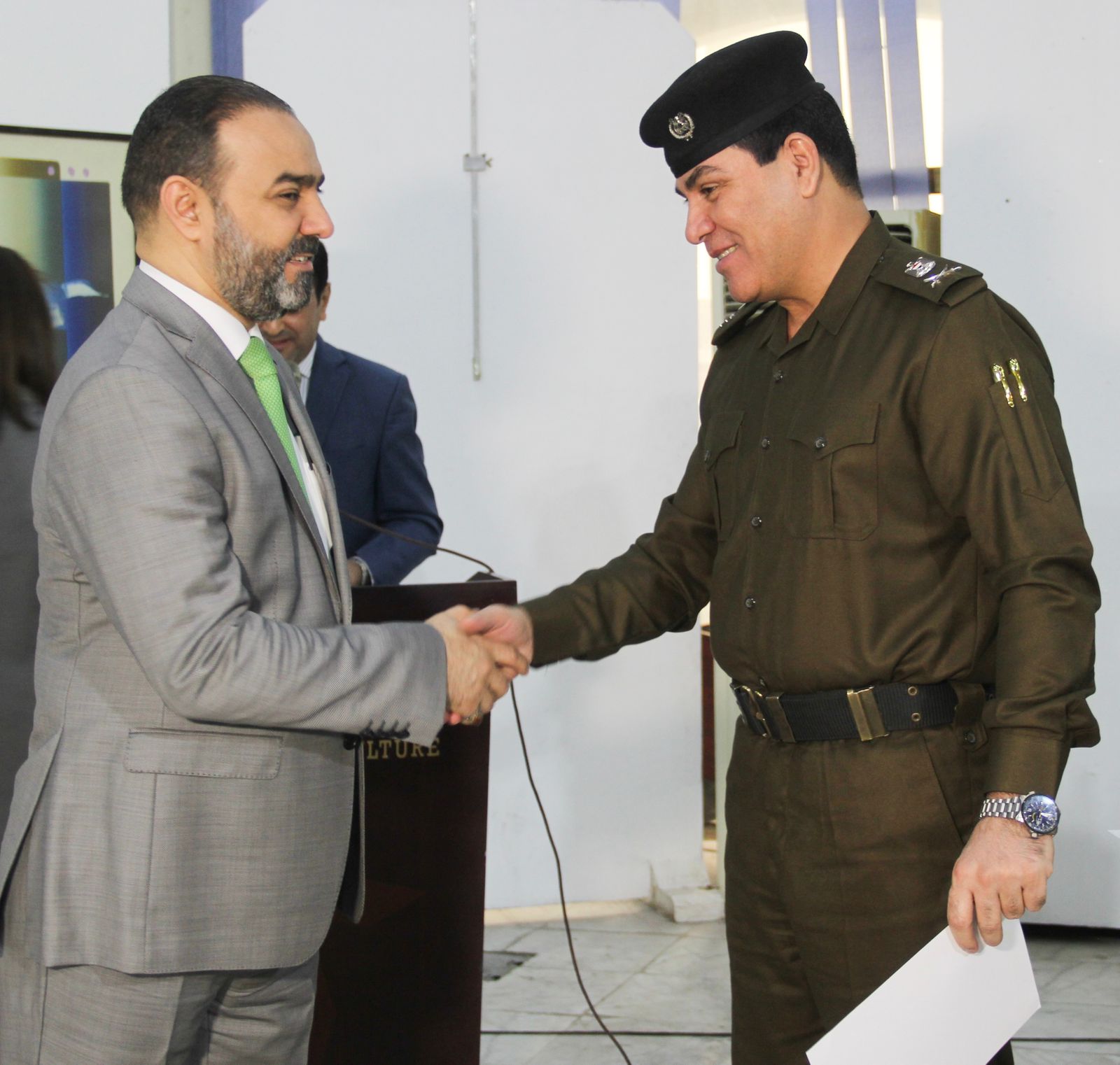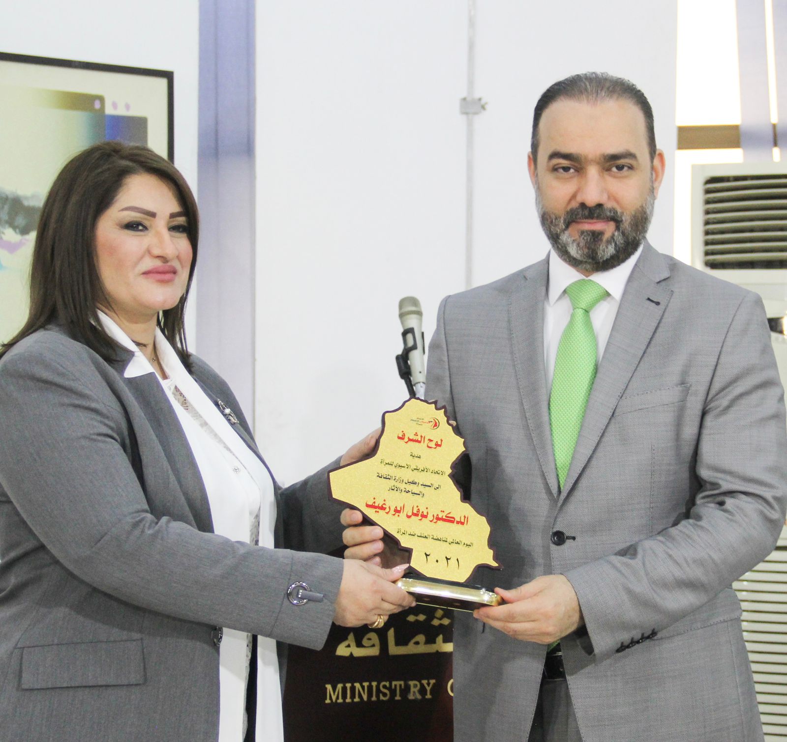 وفي ختام الندوة التي حضرها الشاعر والكاتب فوزي أكرم ترزي واللواء اسماعيل الكريطي مدير شرطة الرصافة ومدير شعبة التنسيق العشائري في مديرية الشرطة المجتمعية ومجموعة من الباحثين والمختصين في شؤون المرأة وعدد من القنوات الإعلامية ، قدمت مستشارة الاتحاد الافريقي الاسيوي الدكتورة منى الربيعي لوح الاتحاد الى الدكتور نوفل ابورغيف تقديراً لجهوده ودوره الداعم والساند لهذه الانشطة والفعاليات ، وفي ذات السياق قدم السيد الوكيل عدداً من الشهادات التقديرية للمشاركين في الندوة .