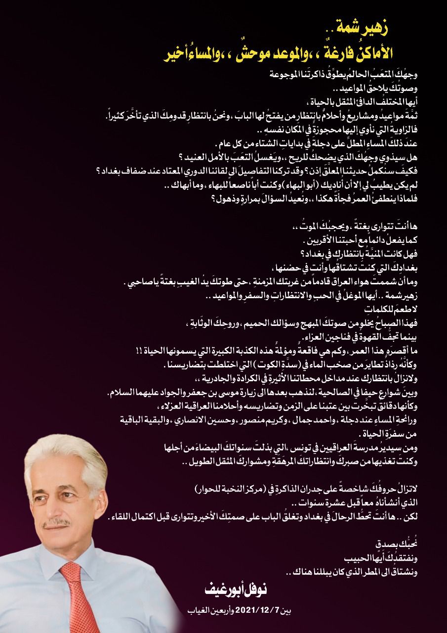 وما أن شممتَ هواء العراق قادماً من غربتك المزمنةِ ، حتى طوتكَ يدُ الغيبِ بغتةً ياصاحبي ..