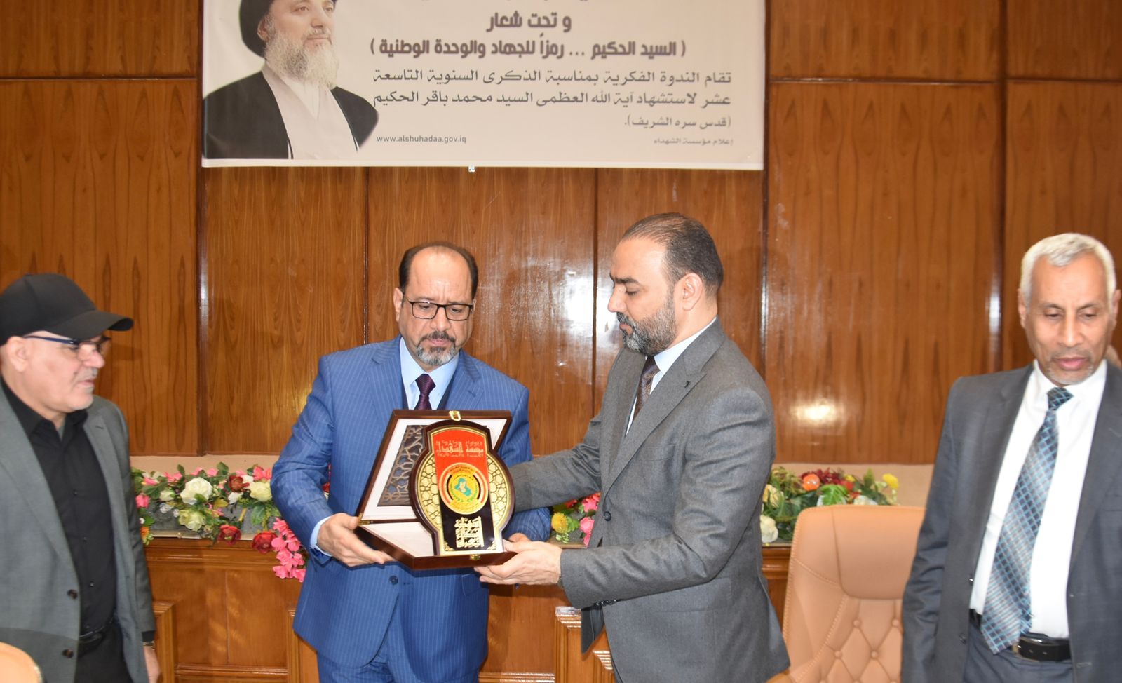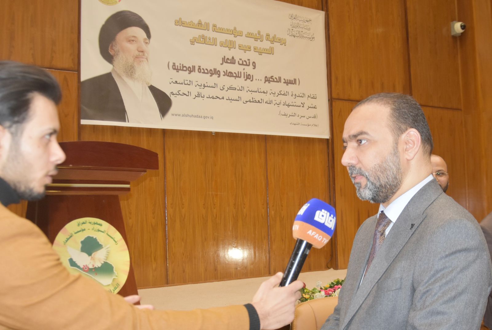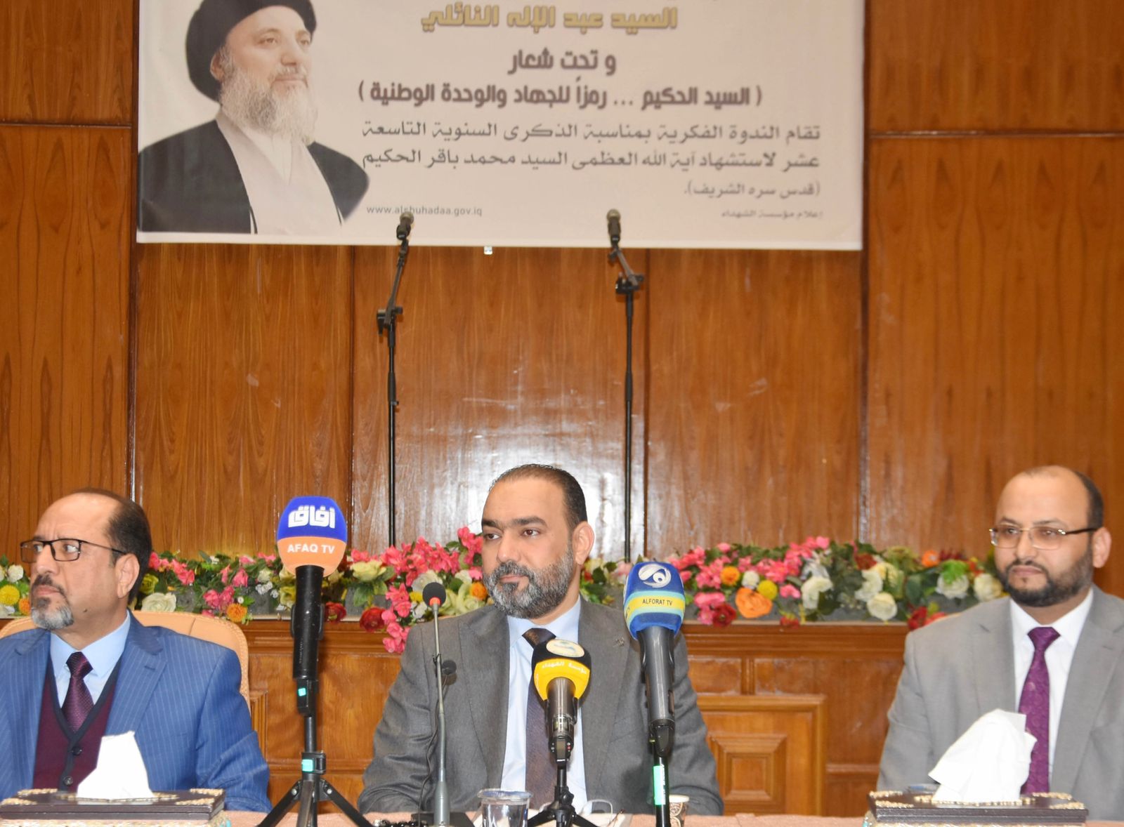 تحت عنوان (السيد الحكيم رمزٌ للعطاء والوحدة الوطنية)وبرعاية رئيس مؤسسة الشهداء السيد عبد الأله النائلي أحيت المؤسسة الذكرى التاسعة عشرة لاستشهاد آية الله العظمى السيد محمد باقر الحكيم ضمن سلسلة الاحتفاءات والفعاليات الوطنية بيوم الشهيد العراقي ، وترأس الندوة التفاعلية وكيل وزارة الثقافة وعضو المكتب السياسي لتيار الحكمة الوطني الدكتور نوفل ابورغيف بحضور نخبة من الاكاديميين والمثقفين والاعلاميين وعدد من النواب والمدراء العامين في المؤسسة وكوادر مديرية شهداء جرائم البعث ومديرية شهداء الحشد الشعبي ومديرية المحافظات في مؤسسة السجناء السياسيين وعدد من ممثلي منظمات المجتمع المدني والشرطة المجتمعية وسط تغطية اعلامية متميزة .
