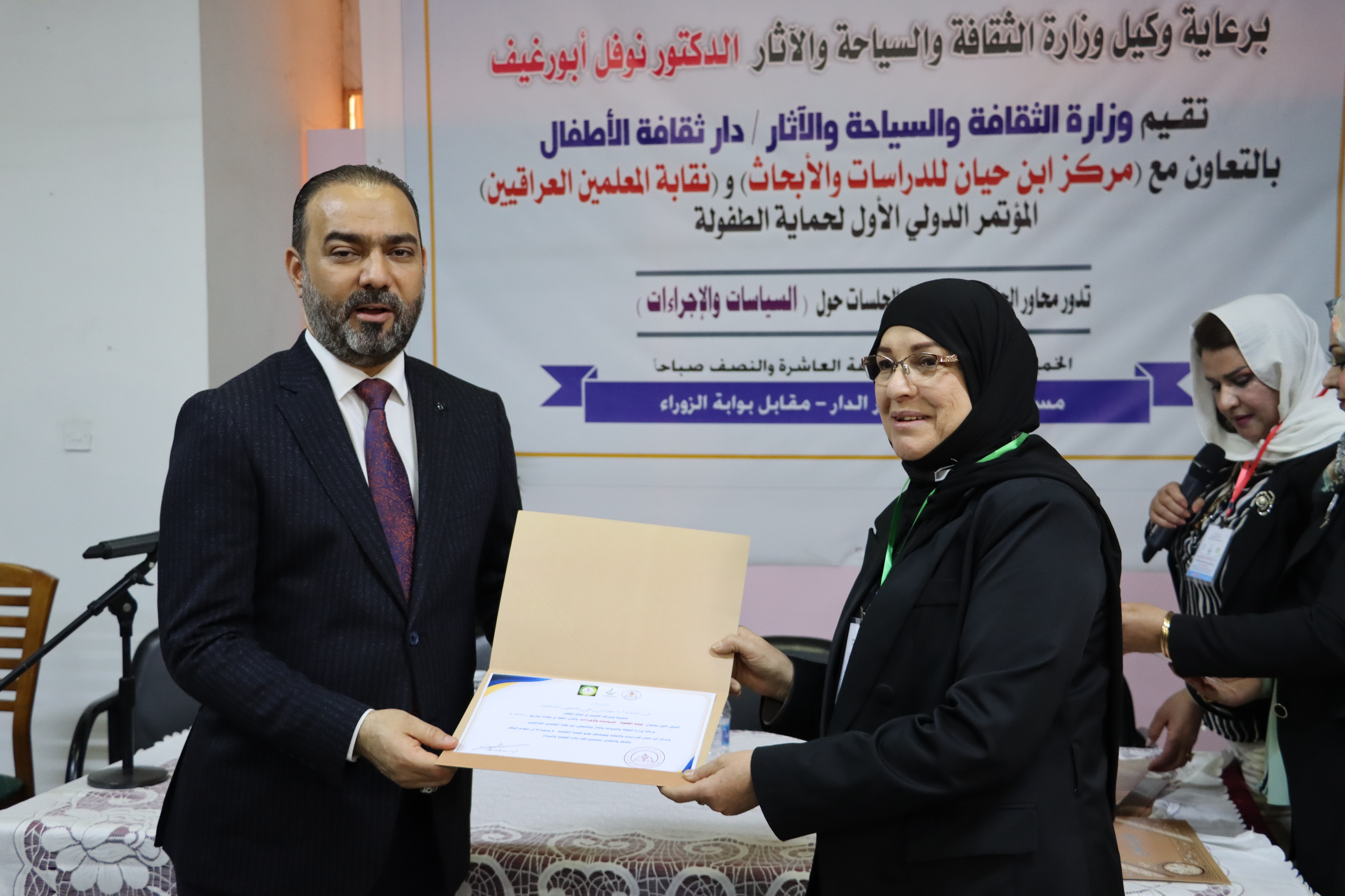 وفي ختام المؤتمر قدم وكيل الوزارة د.نوفل ابورغيف الشهادات التقديرية لمجموعة من الباحثين والناشطين في مجال الطفولة والمشاركين في المؤتمر، داعياً إلى نشر البحوث في المواقع الرصينة للوزارة ومفاصلها ولمركز ابن حيان ،وتسليط الضوء عليها من قبل الاعلام الهادف والجهات المعنية .