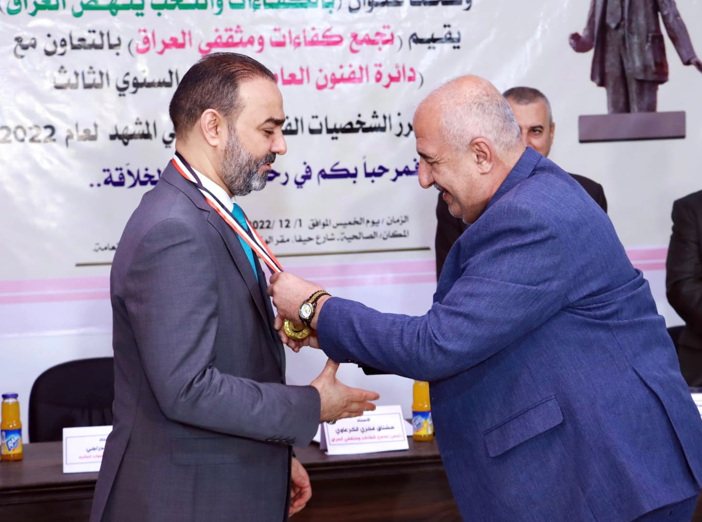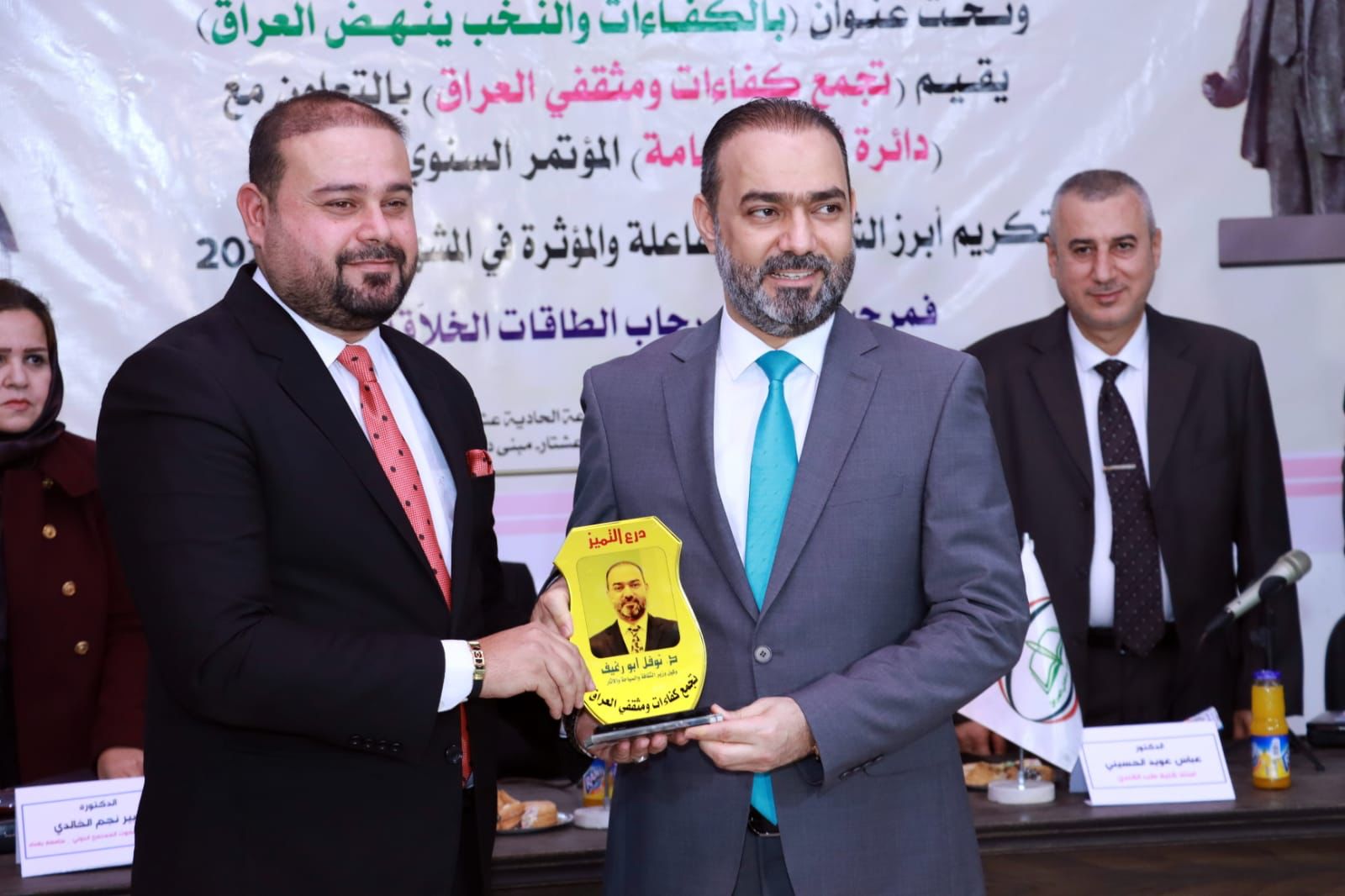 وفي ختام أعمال المؤتمر تم تكريم الوكيل الأقدم #د_نوفل_ابورغيف من قبل تجمع كفاءات ومثقفي العراق و #المركز_الفرنسي للعلماء والمخترعين و #البورد_الأمريكي، ليتولى بعدها ابورغيف توزيع الشهادات التقديرية وتقليد المحتفى بهم #قلادة_الابداع_والتميز مع ادارة التجمع، وسط حضور واسع لشخصيات علمية وثقافية وفنية من عمداء كليات ورؤساء نقابات واعلاميين ونجوم الشاشات بينهم الفنانة الرائدة # فاطمة_الربيعي والفنانة #د_ليلى_محمد والفنان #كاظم_ القريشي و #رعد_المشهداني، و#رنيم التميمي، واخرين .